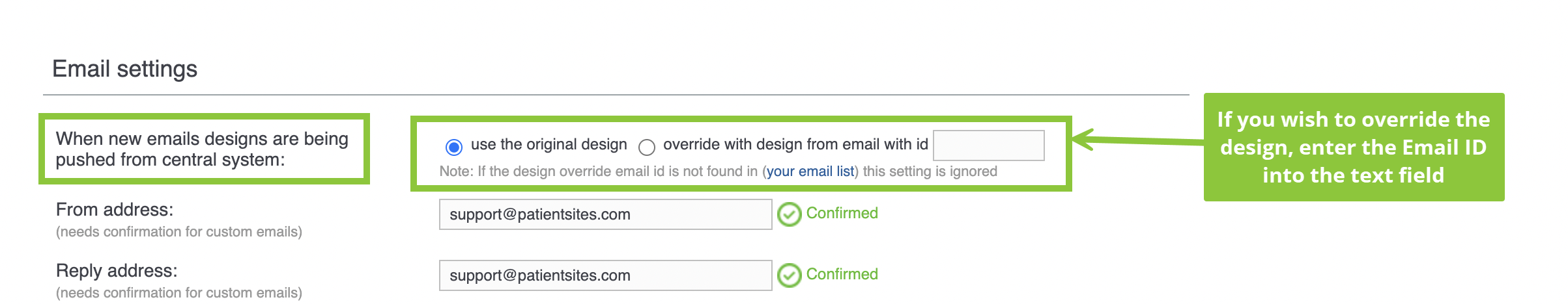 - You can select the type of design used when new email designs are being pushed from the central system by selecting the appropriate option. You can either use the original design or override with design from email with an email id.
