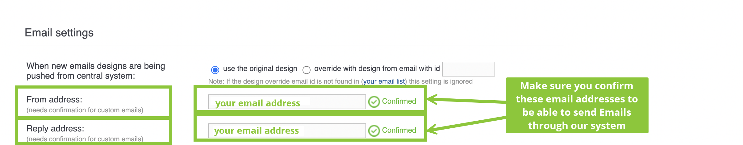 Note: If the design override email id is not found in (your email list) this setting is ignored.
