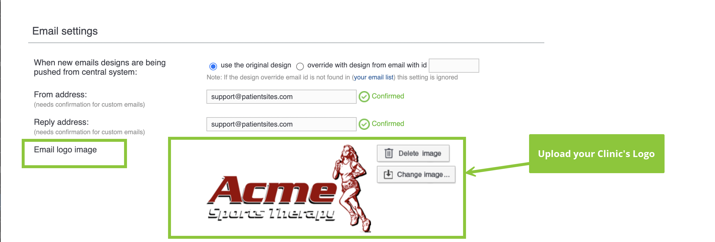- In the Email logo image section, click the Upload Image button to select the logo file from your computer and upload it.