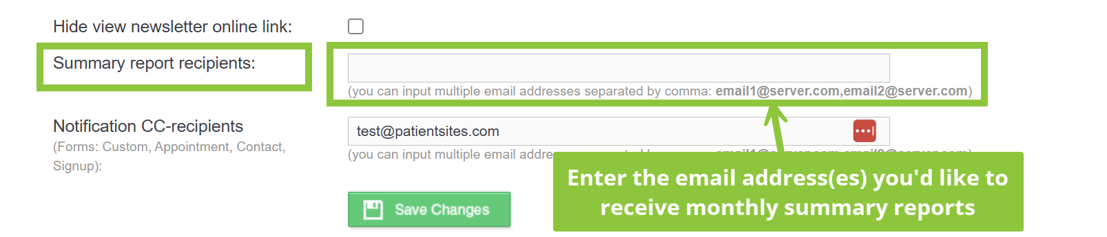 - Use the Summary report recipients field to include additional emails for the monthly summary report