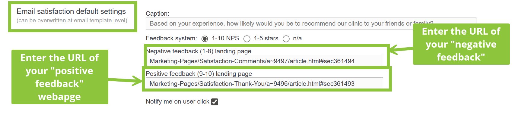 - In the same section, you can also add the URL of your Negative and Positive Feedback webpages respectively.