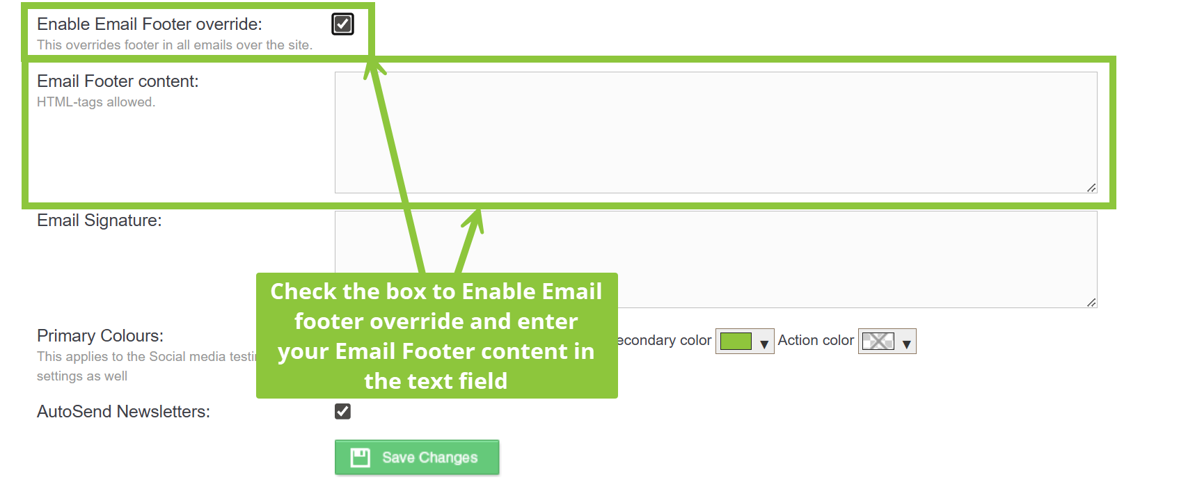 - If you wish to override the Email Footer, check the Enable Email Footer Override box, and enter your new Email Footer content in the text field below. You can also use HTML tags here.