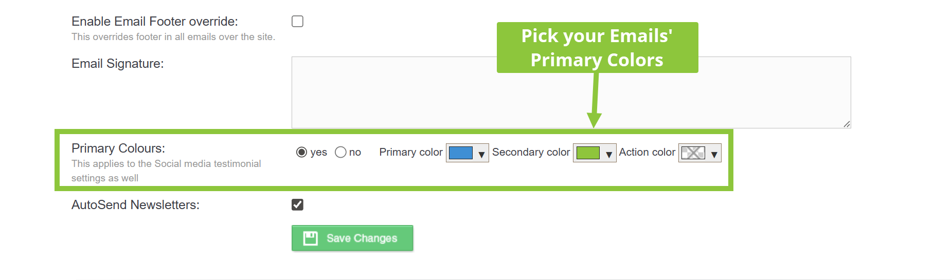 - Customize your Emails' Primary Colors with the color selectors.