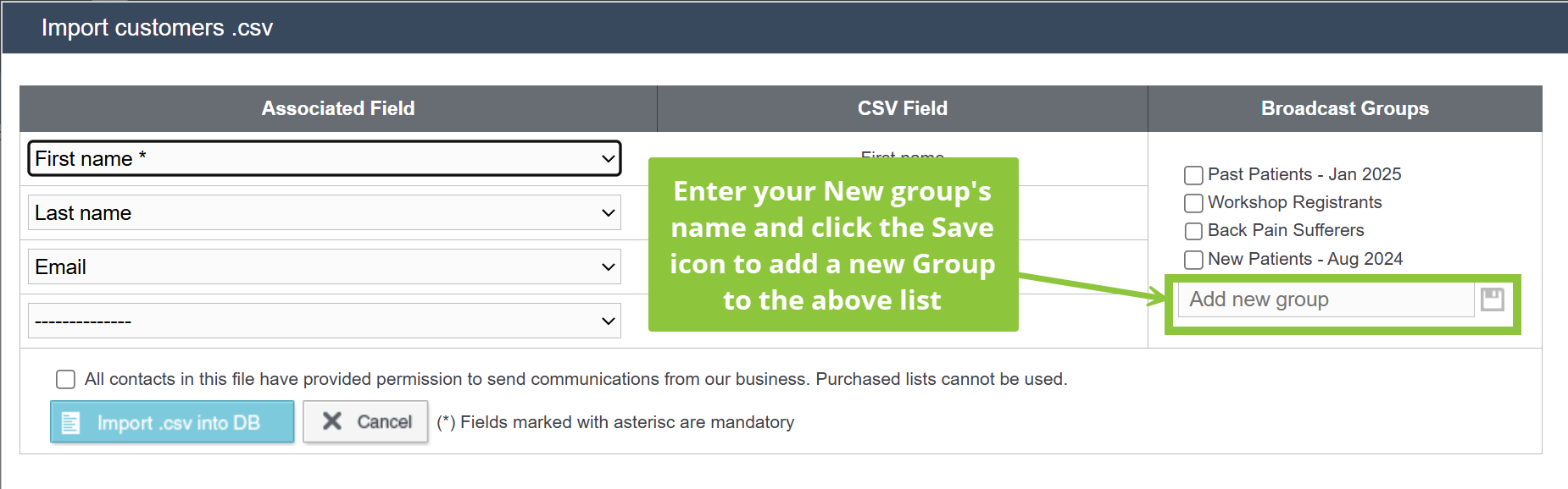 5) Alternatively, if you're importing customers with a .CSV file, you can also create a new group through that process and add the new customers to the group right away.
