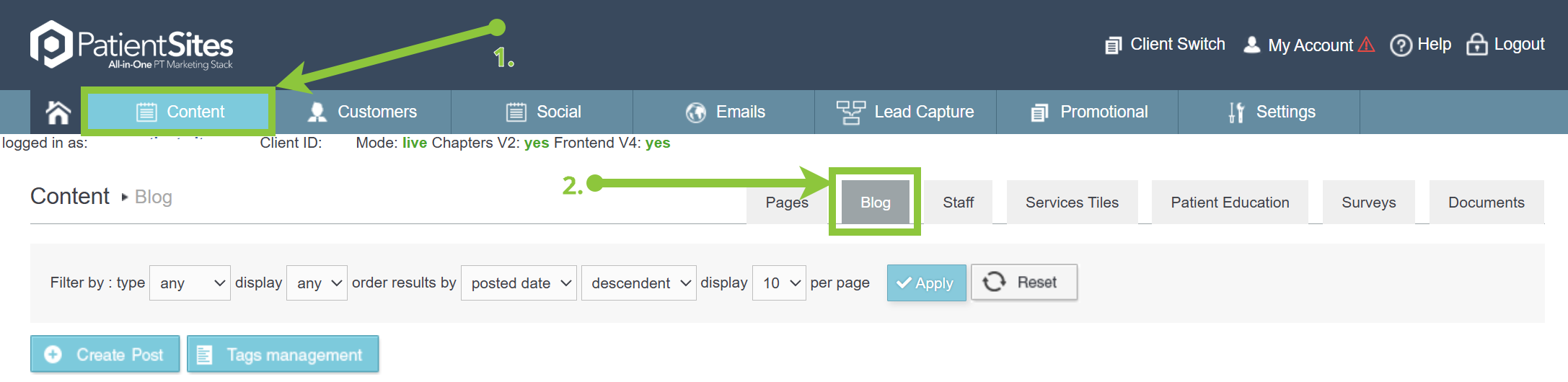 2) Click on Content in the main menu and select Blog