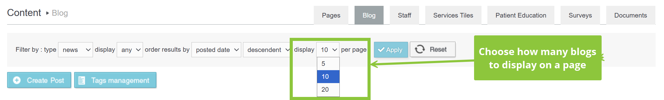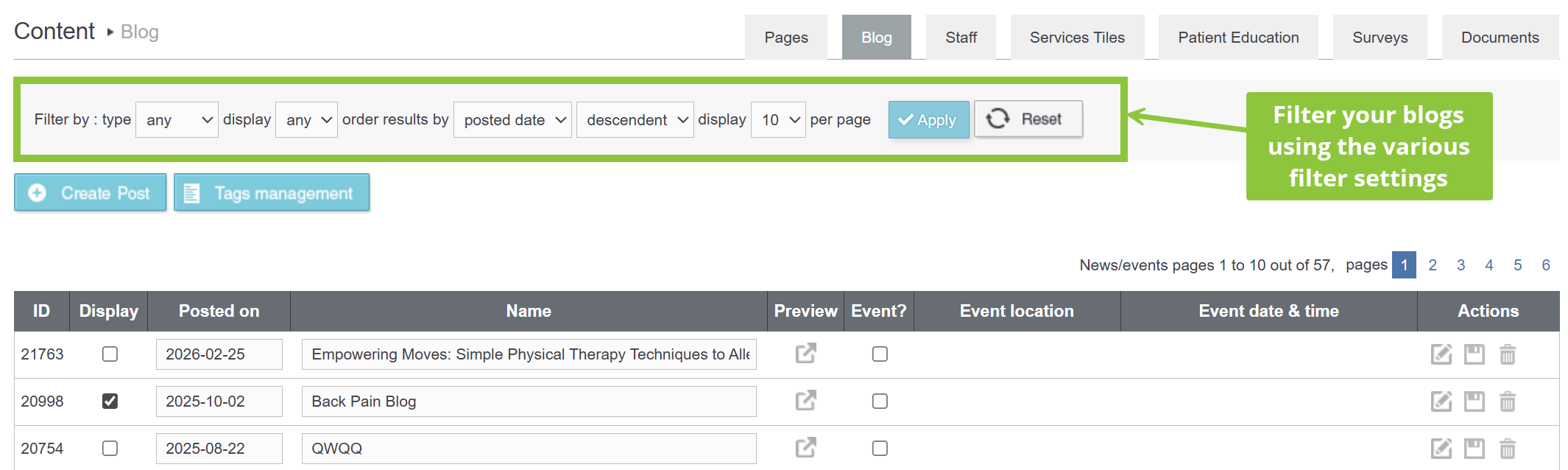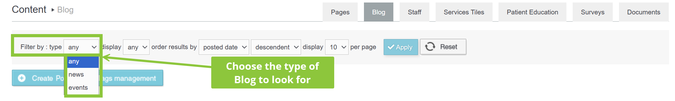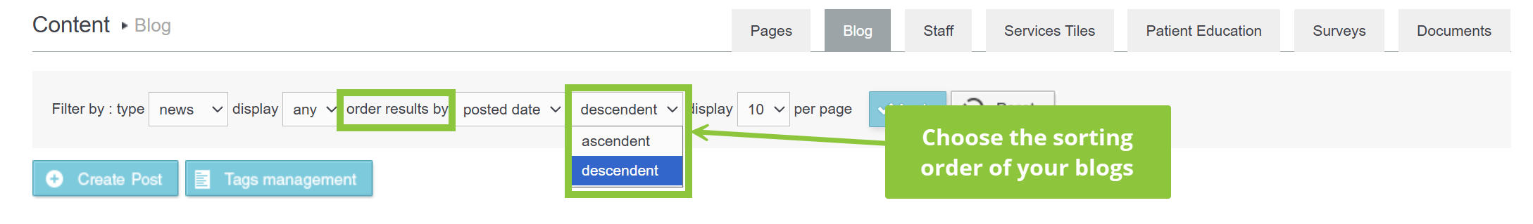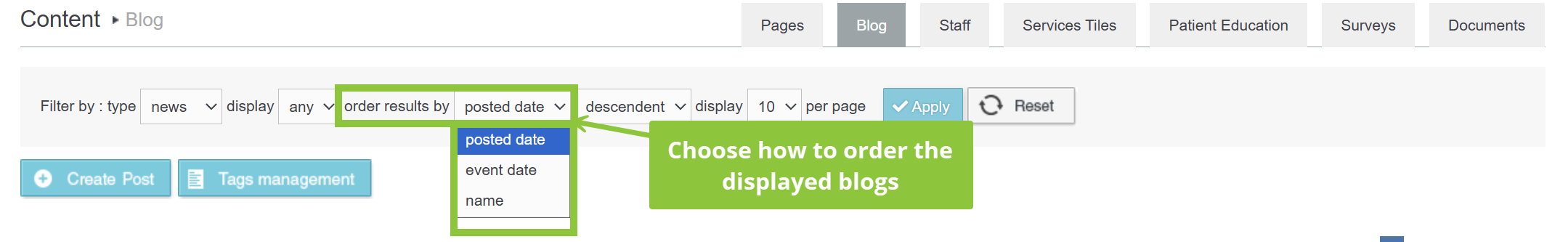 - With the Order Results by drop down list you can filter blogs based on the date of posting or event date or name. The available options are Posted Date, Event Date and Name.