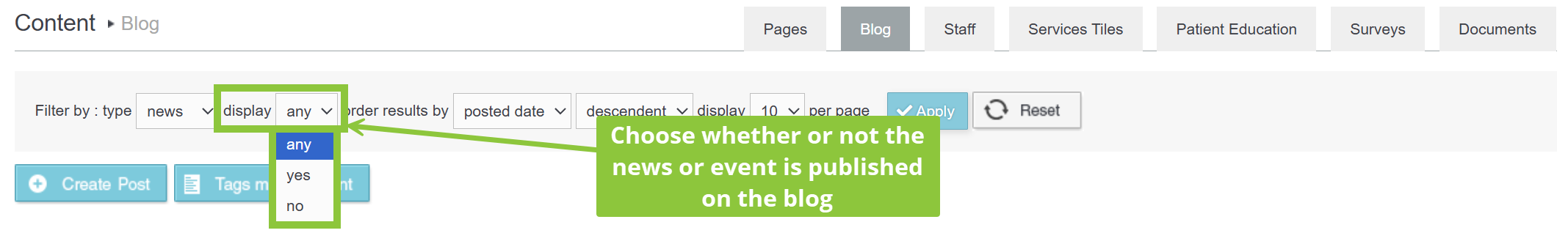 - You can filter results based on whether or not the news or event is published on the blog. Select the display type of news or events from the Display drop down list. The available options are Any, Yes and No.
