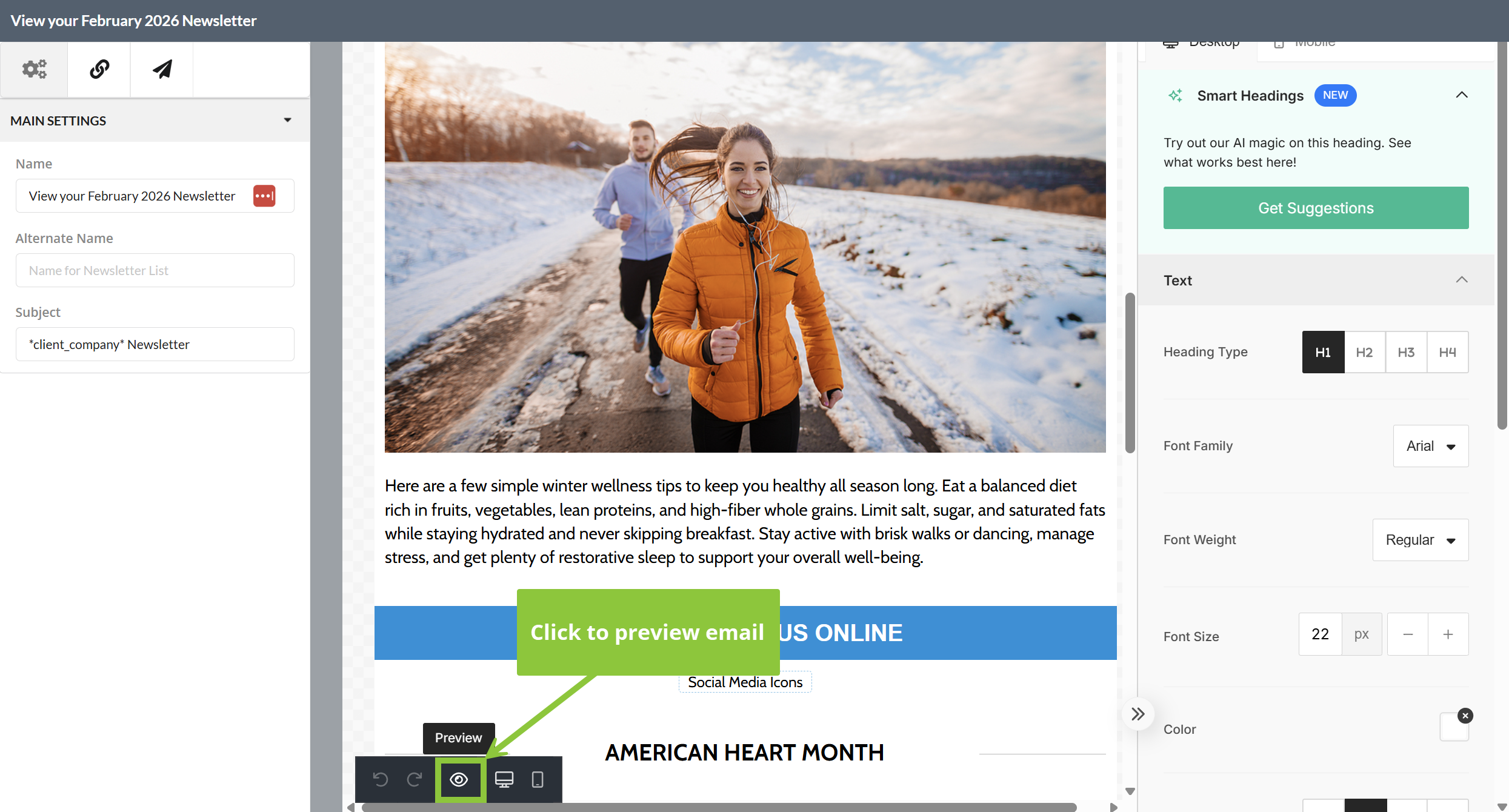 6) To preview the newsletter, scroll to the bottom of the editor box and click on the Eye icon. You can view it in desktop mode or mobile mode.