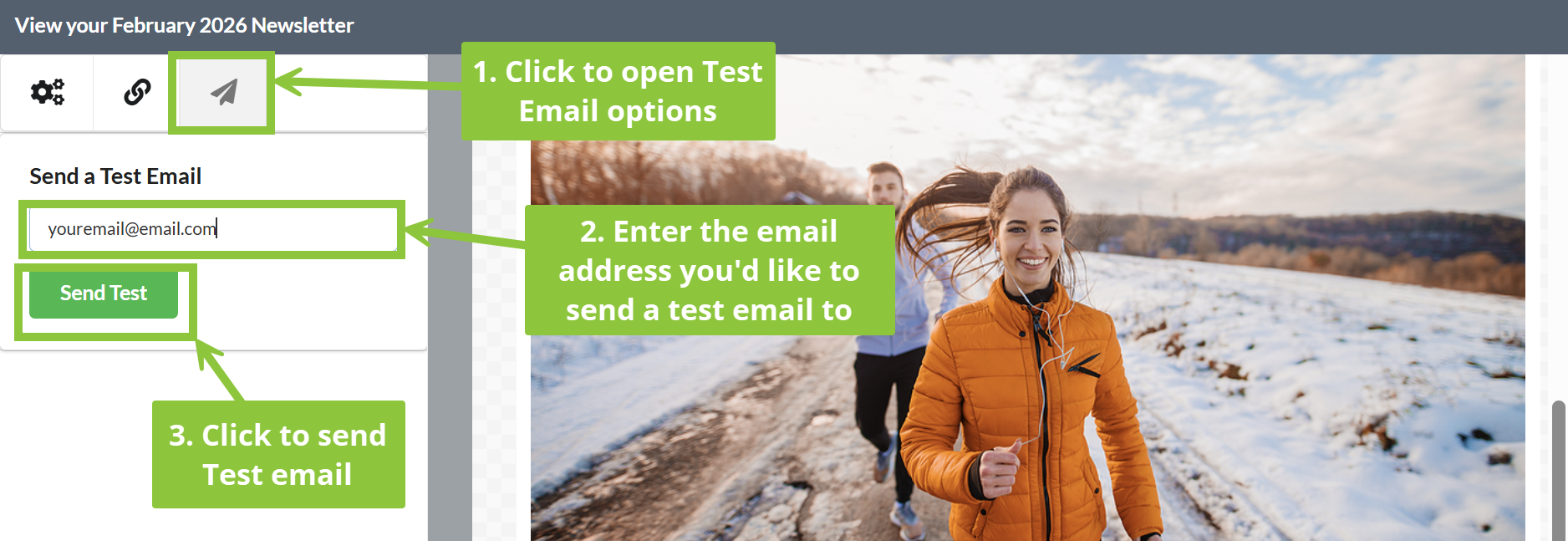 7) You can also send a test email to yourself before you send it to everyone in your customer list by clicking the Test Send icon on the left. Enter the email address you want to send the test to and press Send Test.