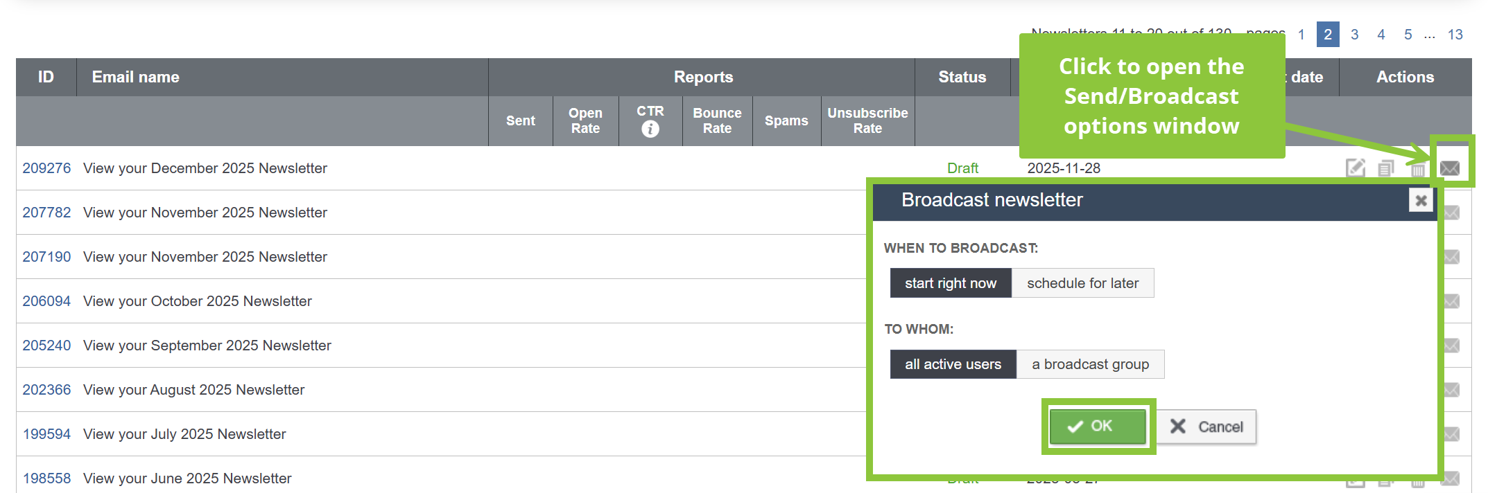 3) Choose the email you would like to schedule to send out and click on the Mail icon, labeled as "Send email (click for more options)" at the end of its row, under the Actions column. This will open the Send/Broadcast options pop-up box.