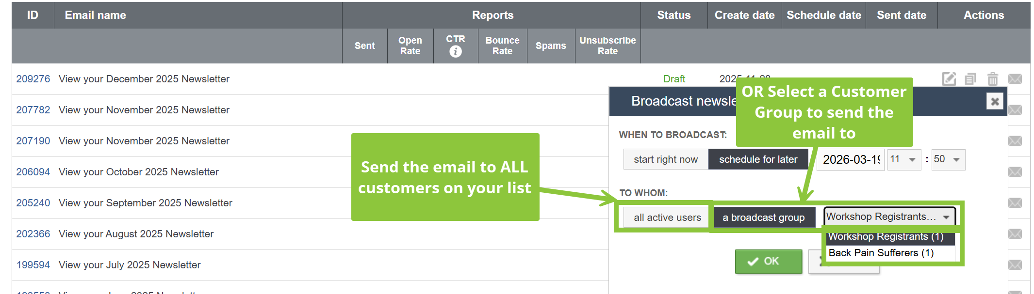 5) Once you're done, click on the green OK button to save the changes. This will either send the email out right away, or save the scheduled date and time and send it out then.