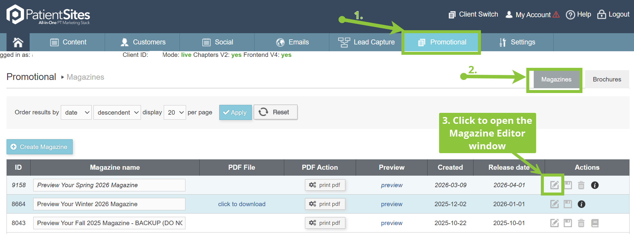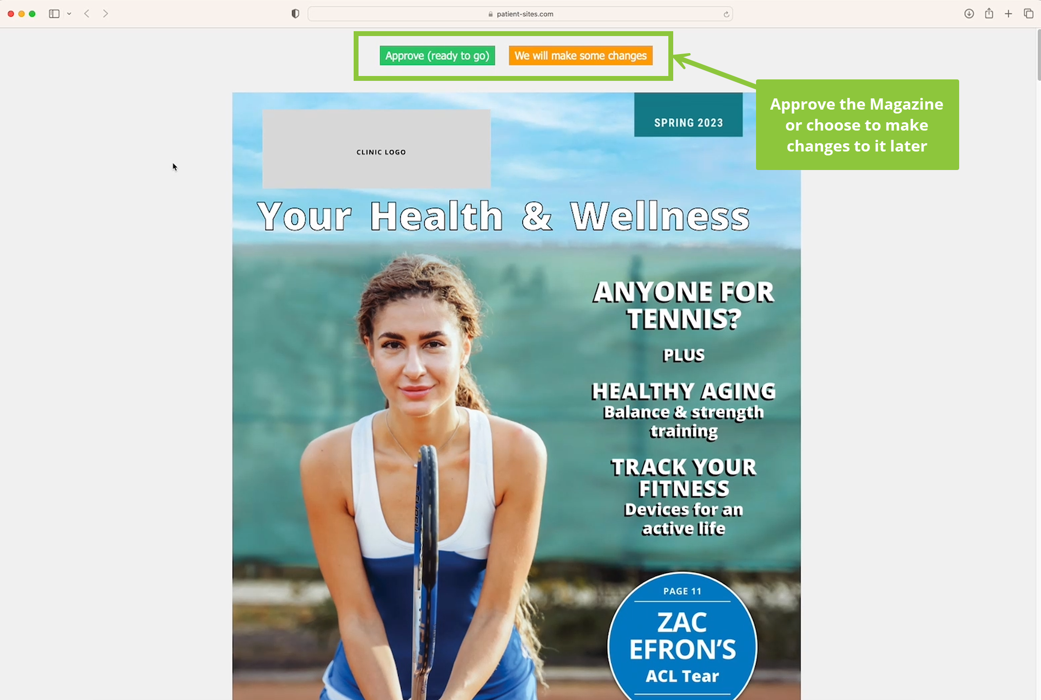 - If you click We will make some changes, the Magazine will not be automatically published on your website, and you will be able to make changes to it in the Promotional menu, under the Magazines submenu if you log in to PatientSites Web Editor at client.patientsites.com.