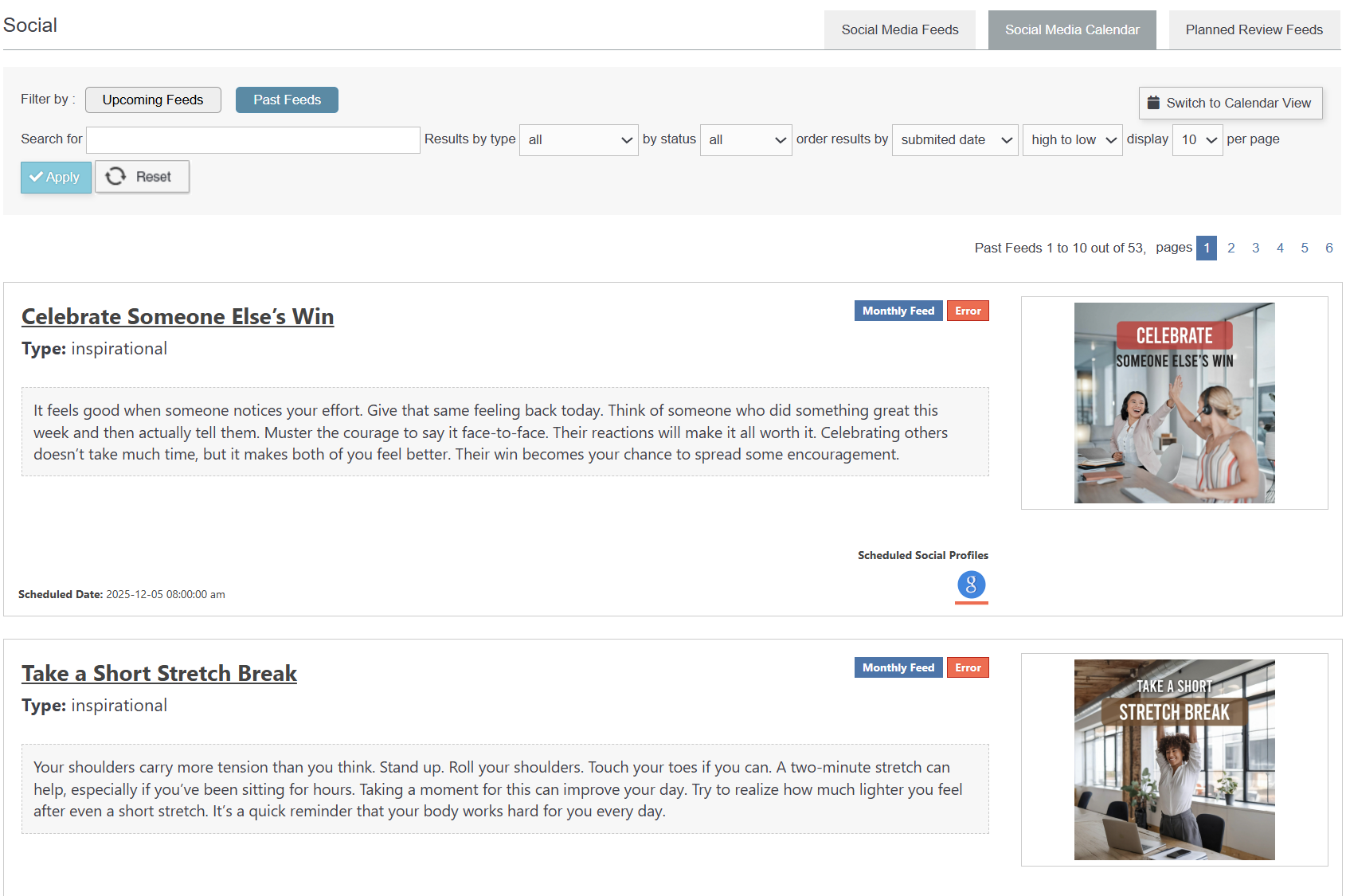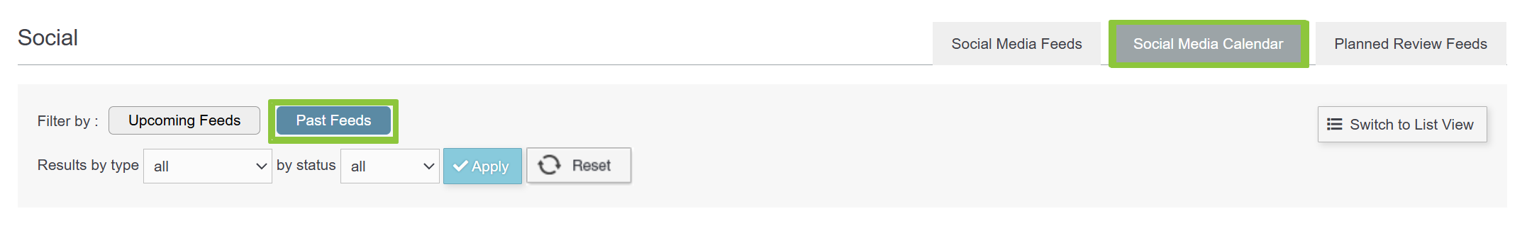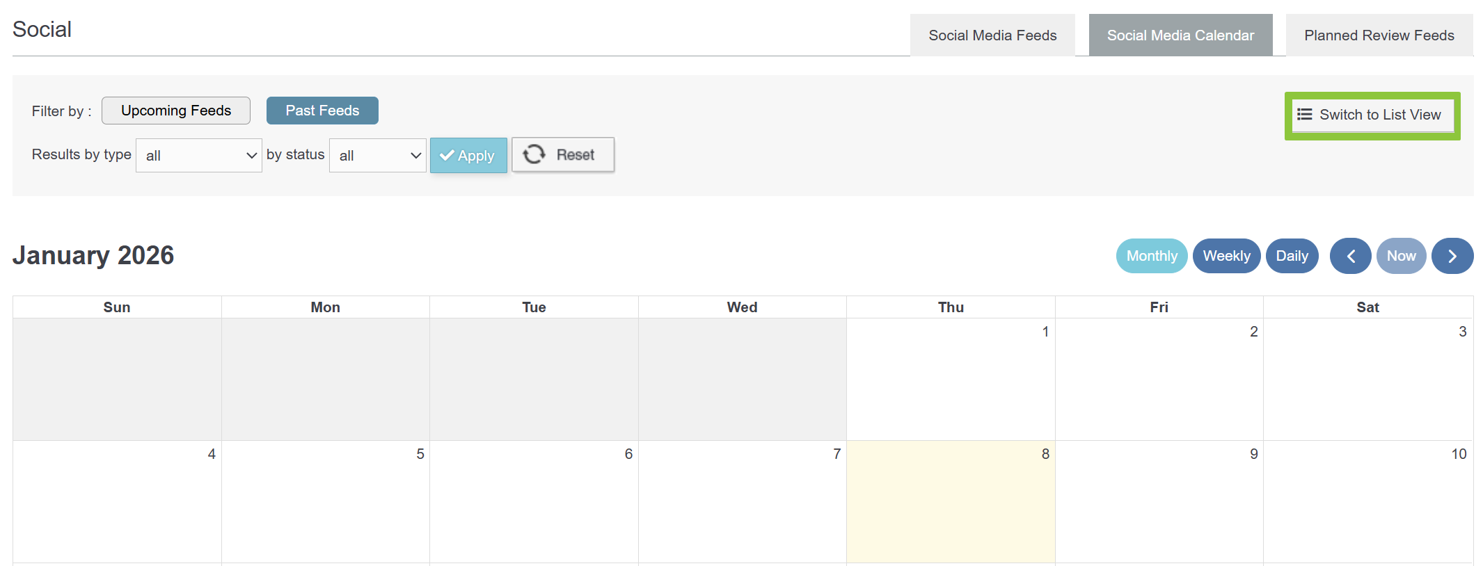 4. Previously scheduled social media posts can be viewed here in a Calendar view, OR you can click the Switch to List View button and see all the past posts listed with their contents visible.