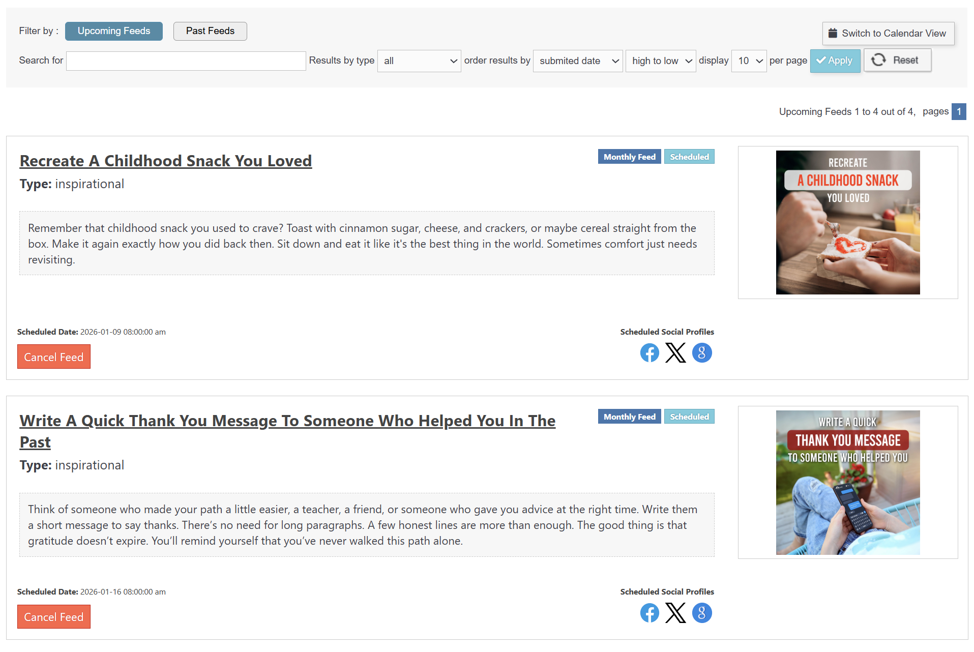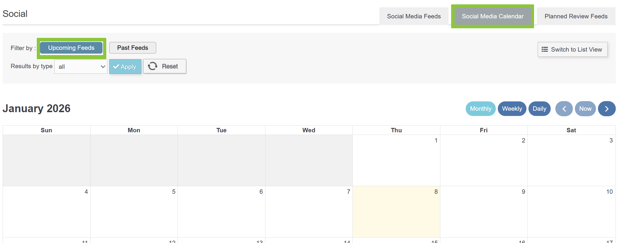 3. Click on Social Media Calendar then click Upcoming Feeds.
