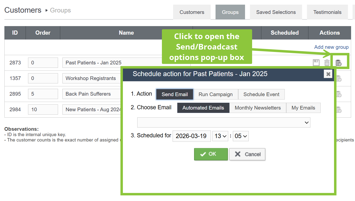 3) On the right side of your Groups list, under the Actions column, in the row of the group you'd like to send an email or campaign to, click the clipboard icon labeled "Broadcast email/Run campaign for this group of customers" to open the Send/Broadcast options pop-up box.