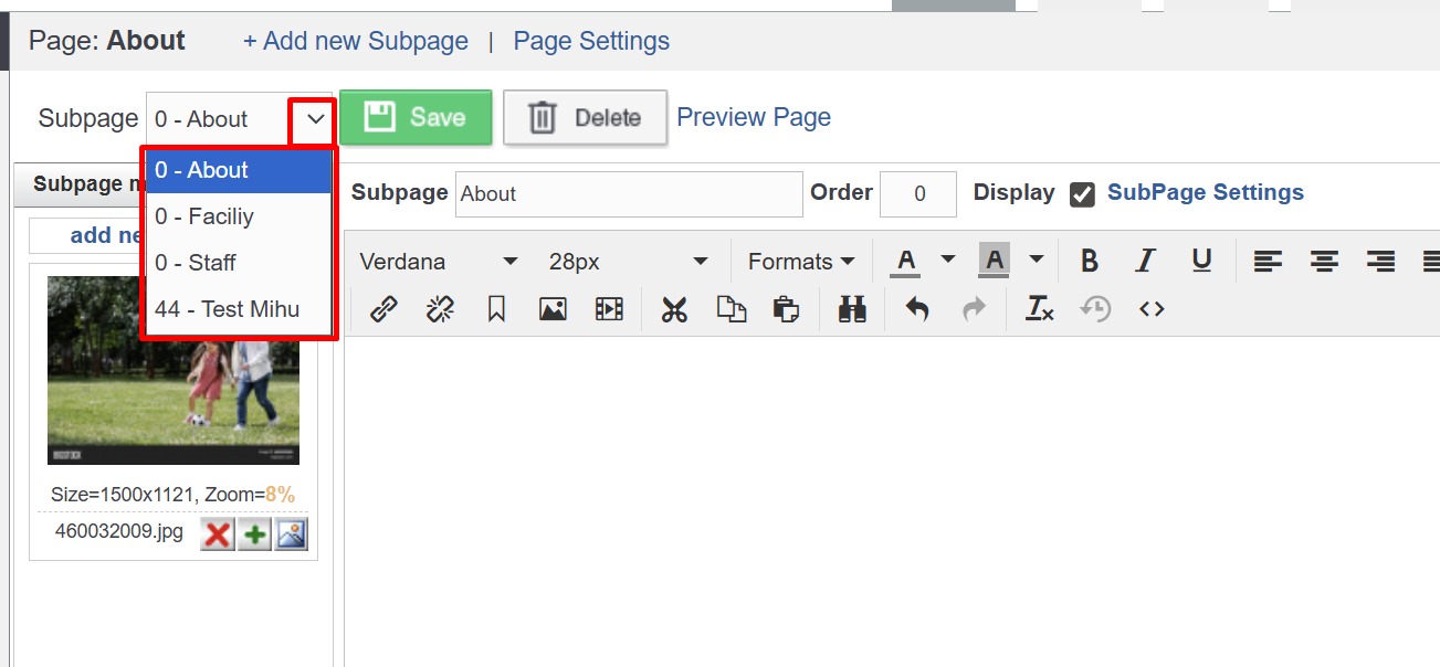 14. You can select a subpage to edit with the Subpage dropdown at the top of the Page editor.