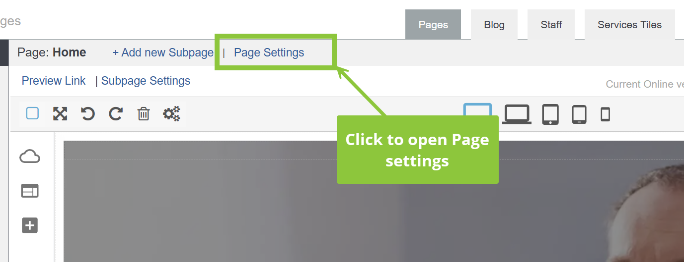 4) At the top of the page editor click the Page Settings button to open the dropdown of various fields for the page.