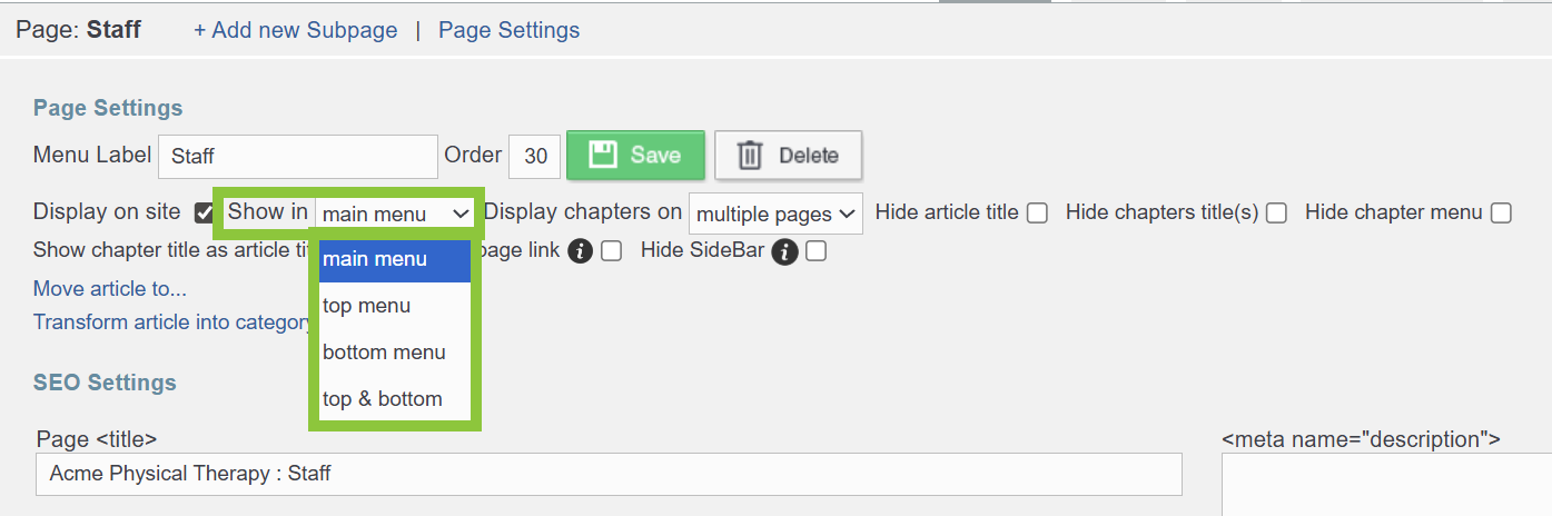 - The Show In drop down list allows you to select the level at which the page is to be displayed. The available options are Main Menu, Top Menu, Bottom Menu and Top & Bottom