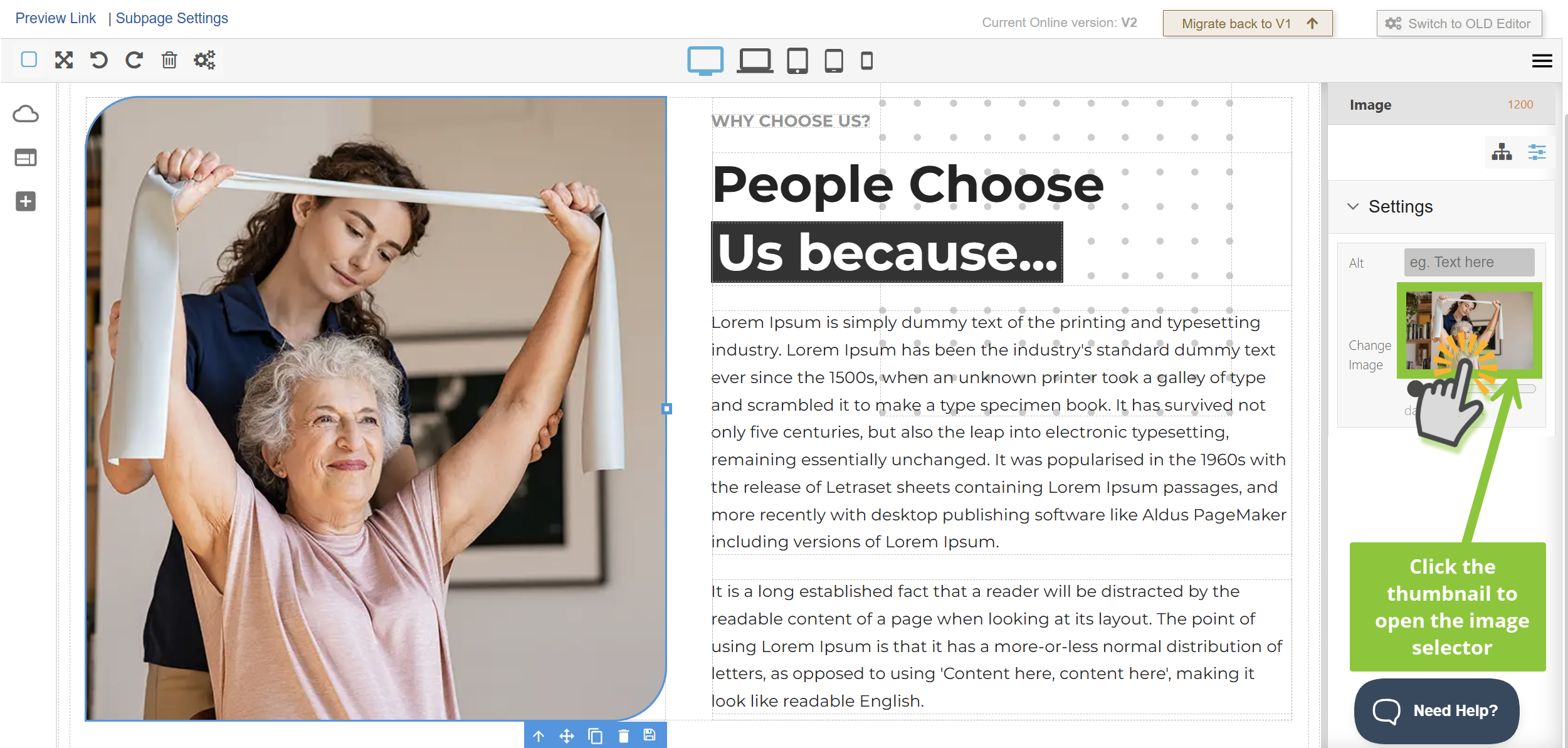 5) On the right side of the Page editor, under Settings click on the thumbnail of the image you selected.