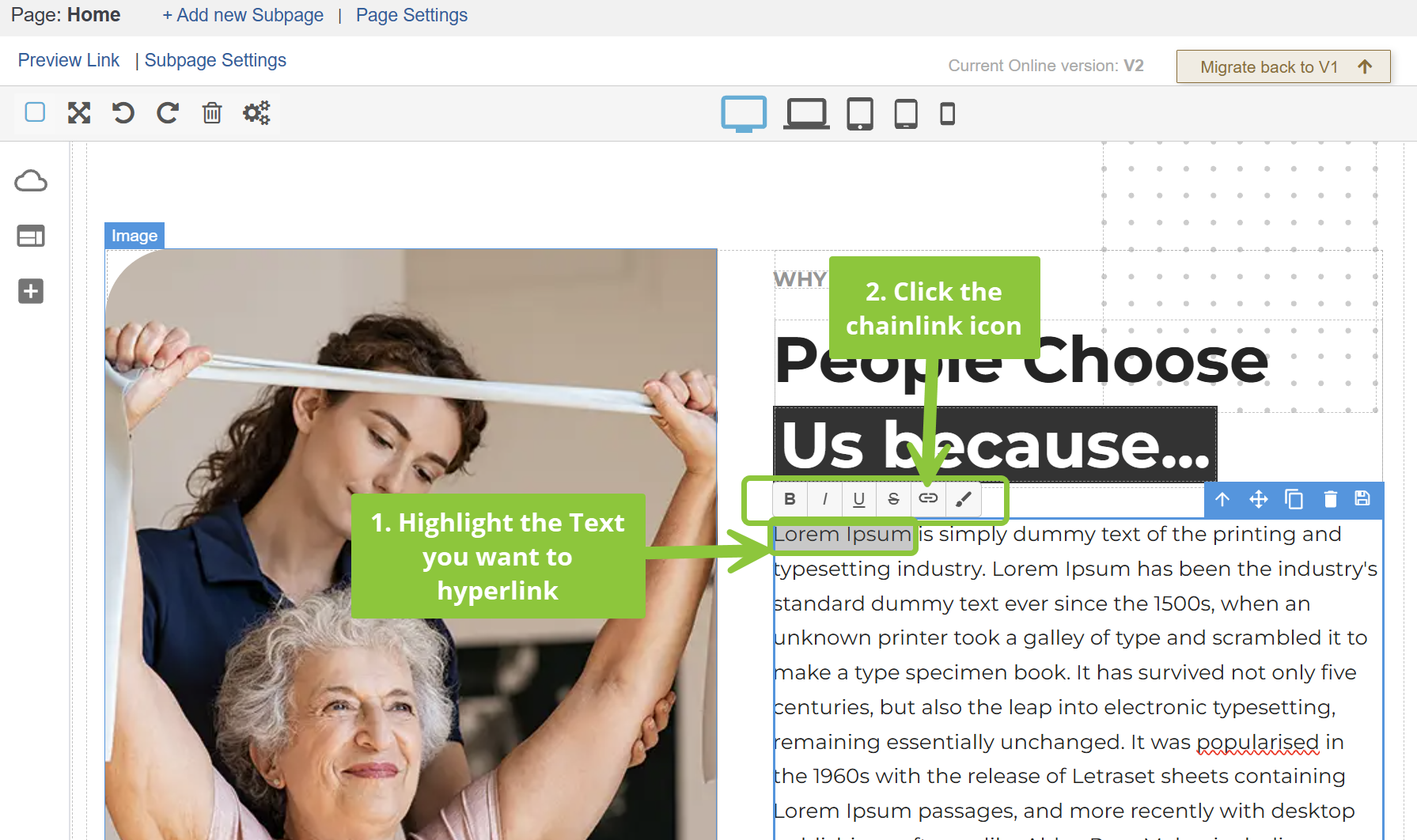 4) To add a link to a bit of text, just highlight the text and click the chain link icon that appears above it.