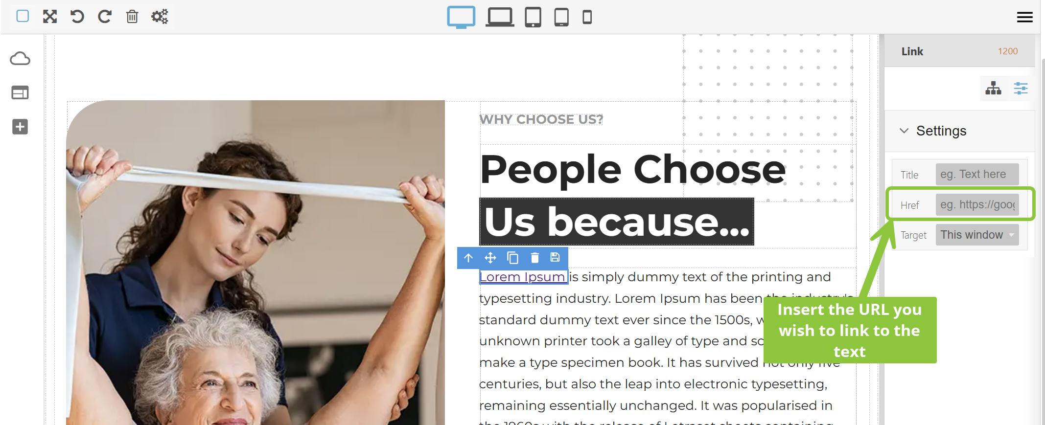 5) On the right side of the Page editor, under Settings, paste your URL in the Href field.