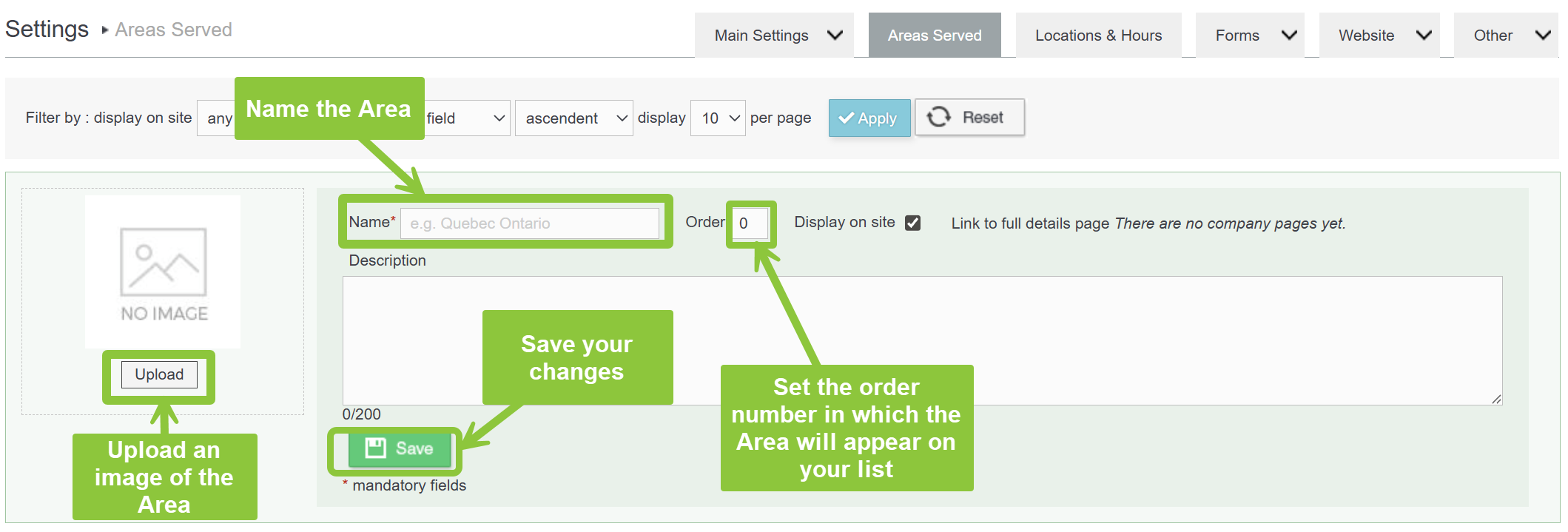 3) A new Area served entry fields will open, where you’ll need to fill out the following: