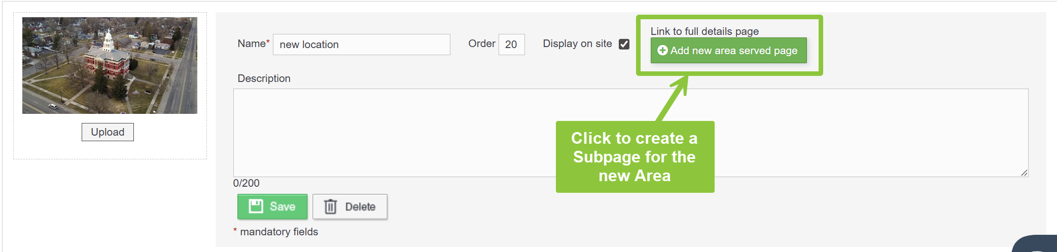 4) In the newly added area’s entry click the green button under “Link to full details page“ to create the area’s own subpage under your Areas Served section, then select the correct page from the dropdown list.
