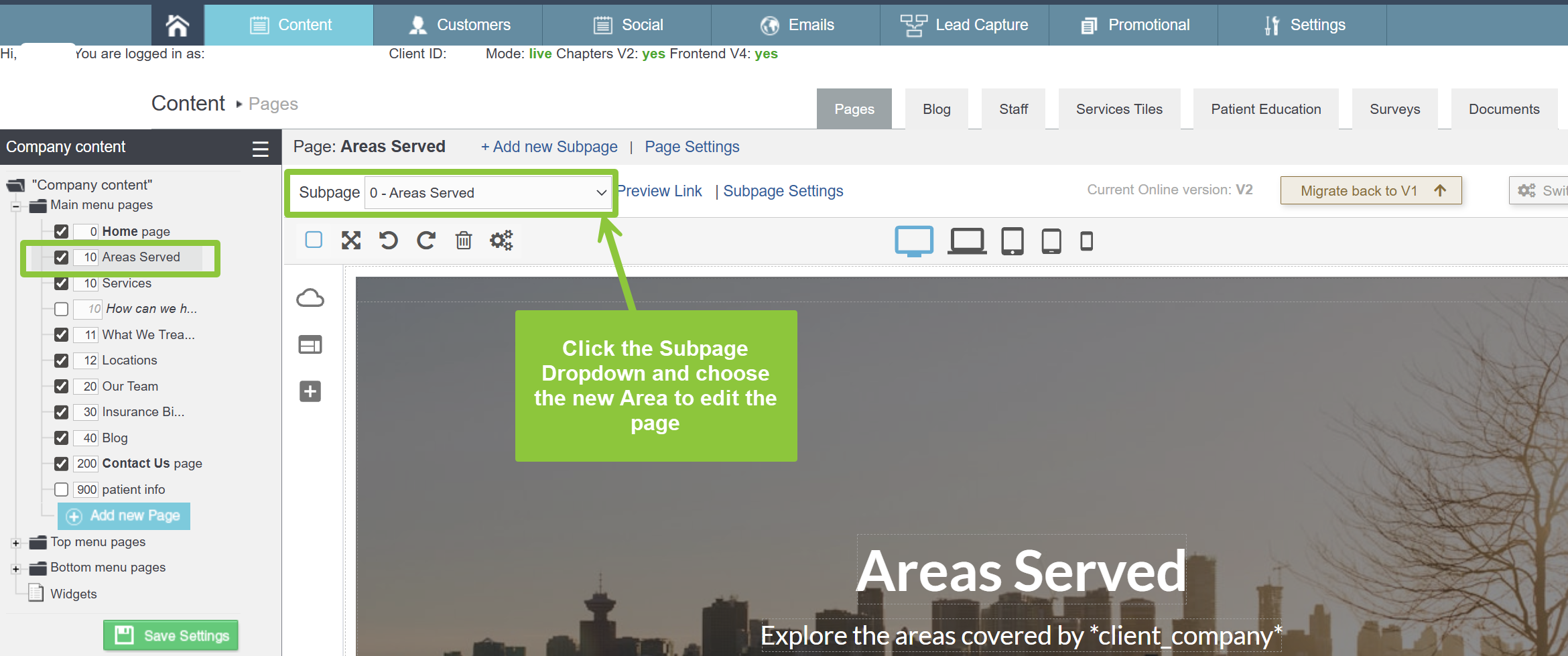 6) At the top of the page editor, use the Subpages dropdown menu to navigate to your newly created Area Served page, and make the edits you want to the page.