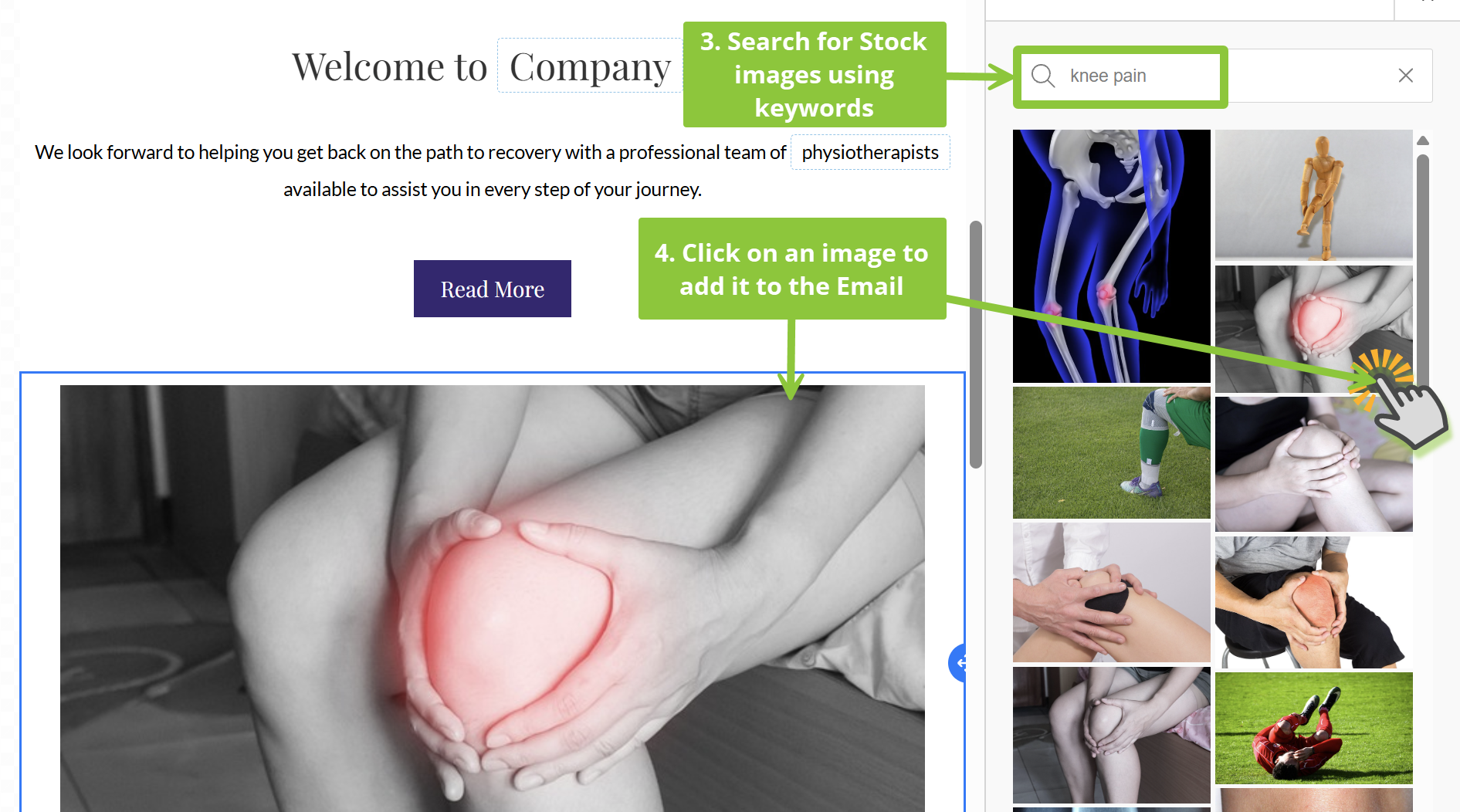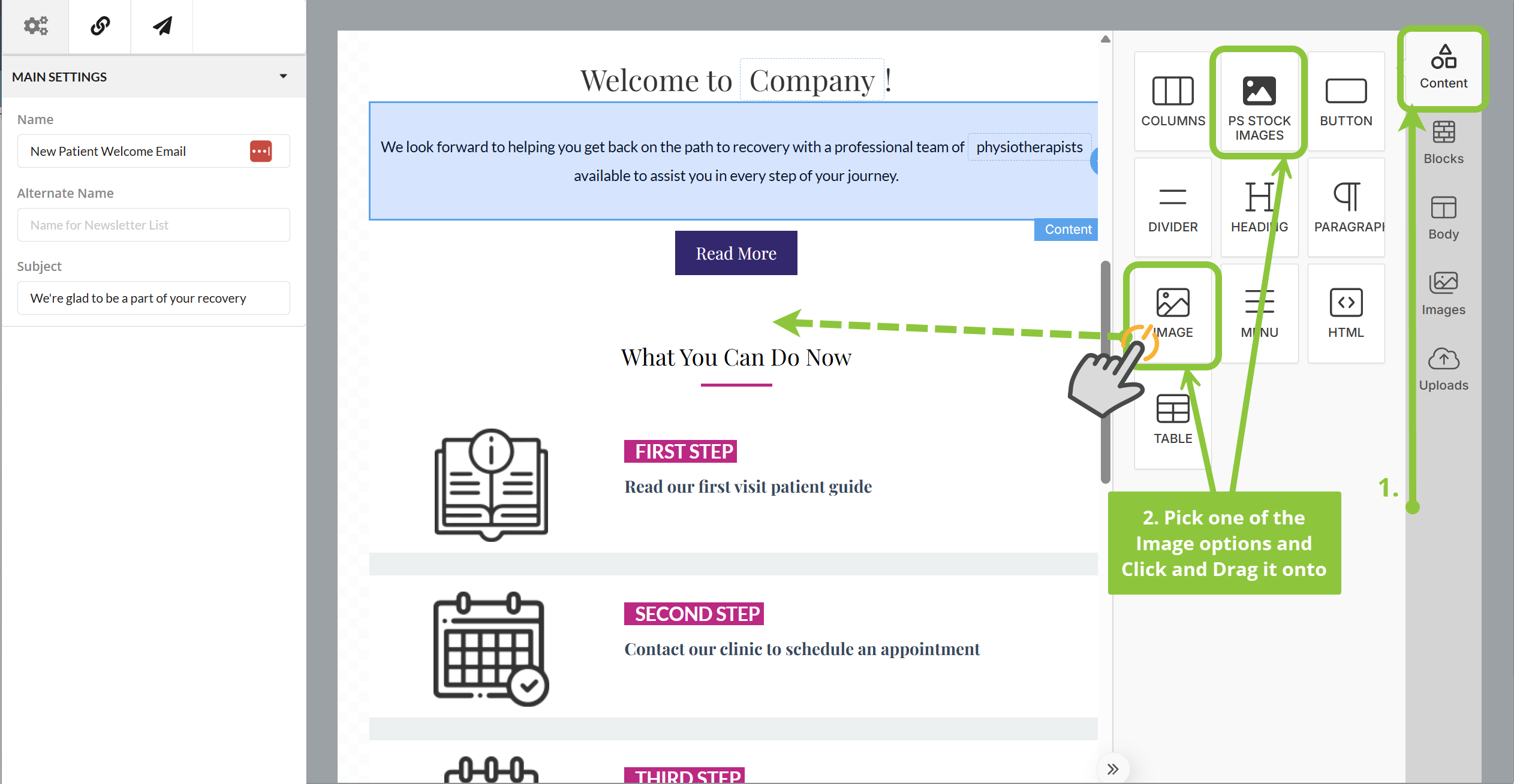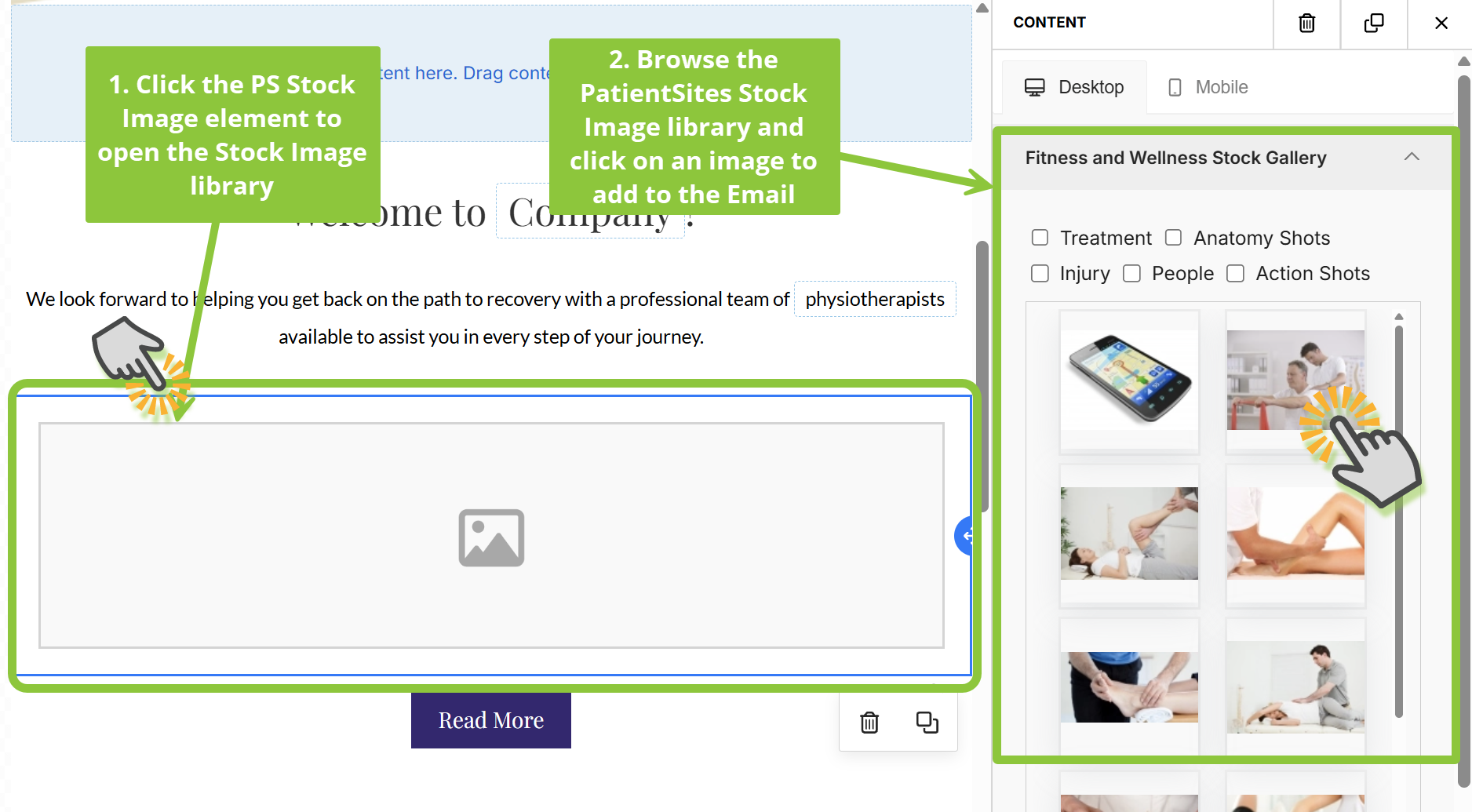 - Click on the PS Stock Images element to bring up the PatientSities Stock Image library on the right side of the Editor. Click on the image you’d like to use to add it to the email.