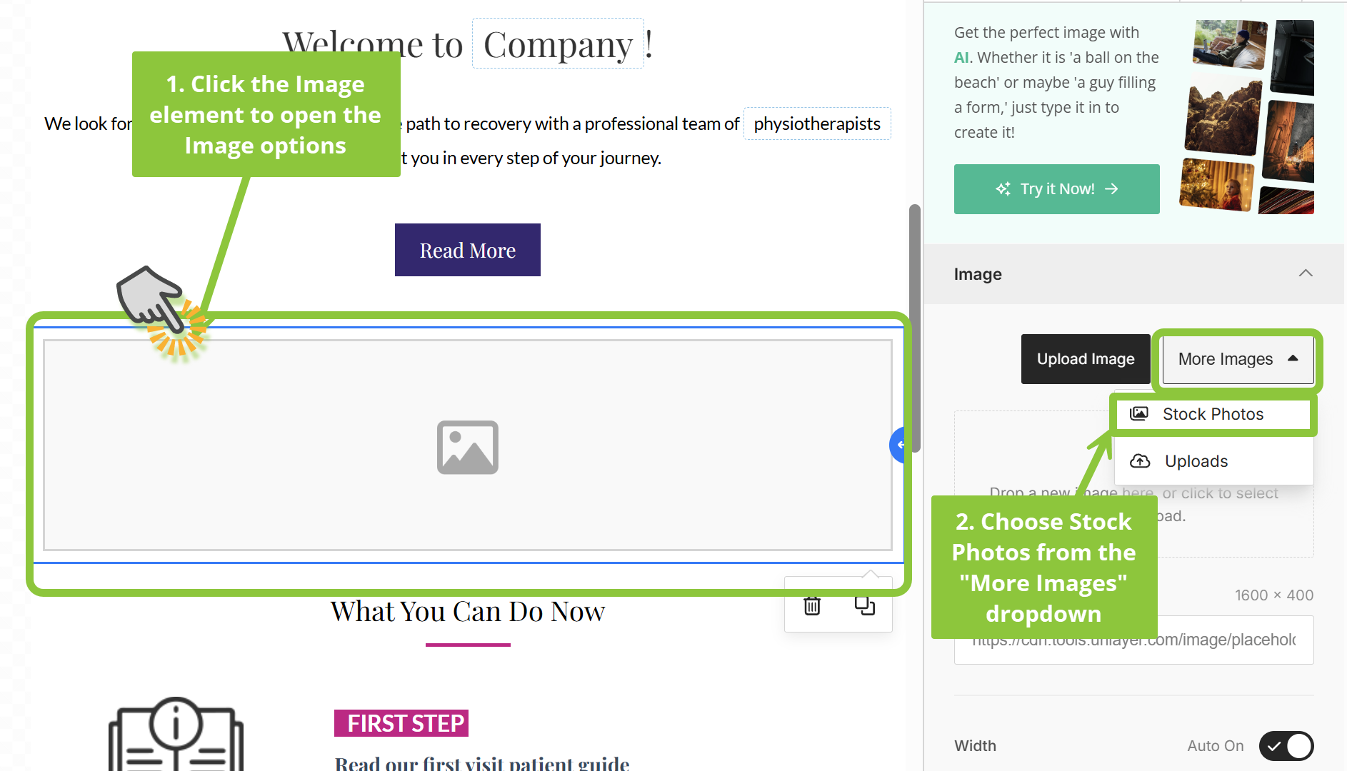 - Click on the Image element to open the Image options on the right. Click “More Images”, and choose Stock Images - this will let you browse stock images from Unsplash, Pexels, Pixabay.
