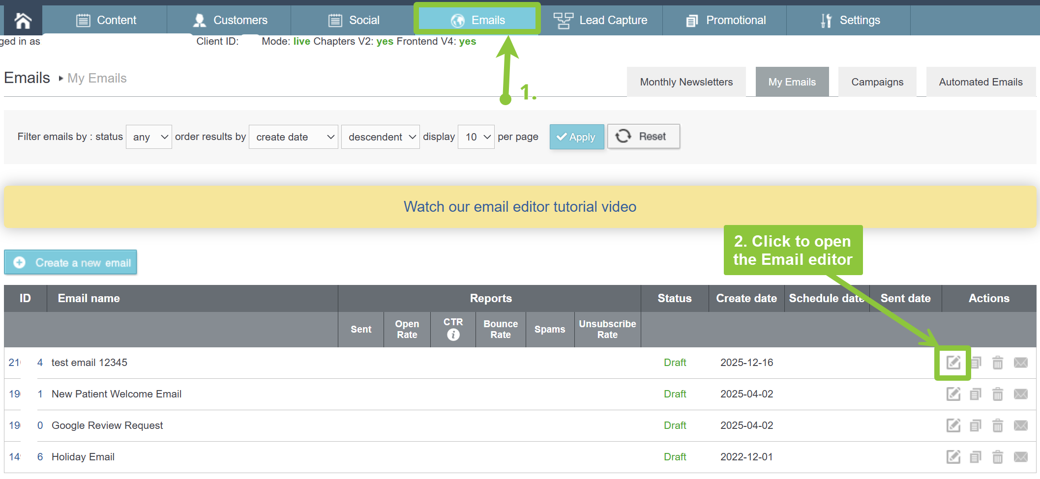 2) Head over to Emails and locate the email you’d like to edit. Click the pencil and paper icon in the Actions column to open the Email Editor, which will open in a separate window.
