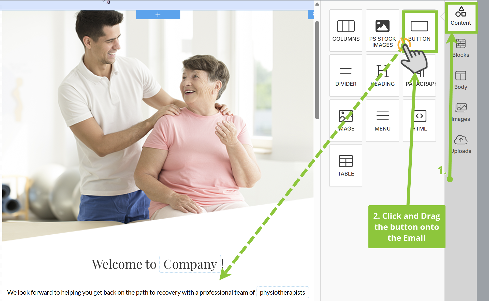 3) Head to the Content tab on the right-most side of the editor and click and drag the Button element onto your email where you’d like to place it.