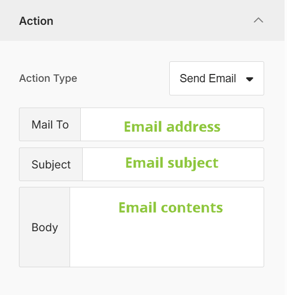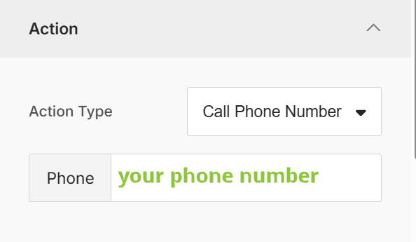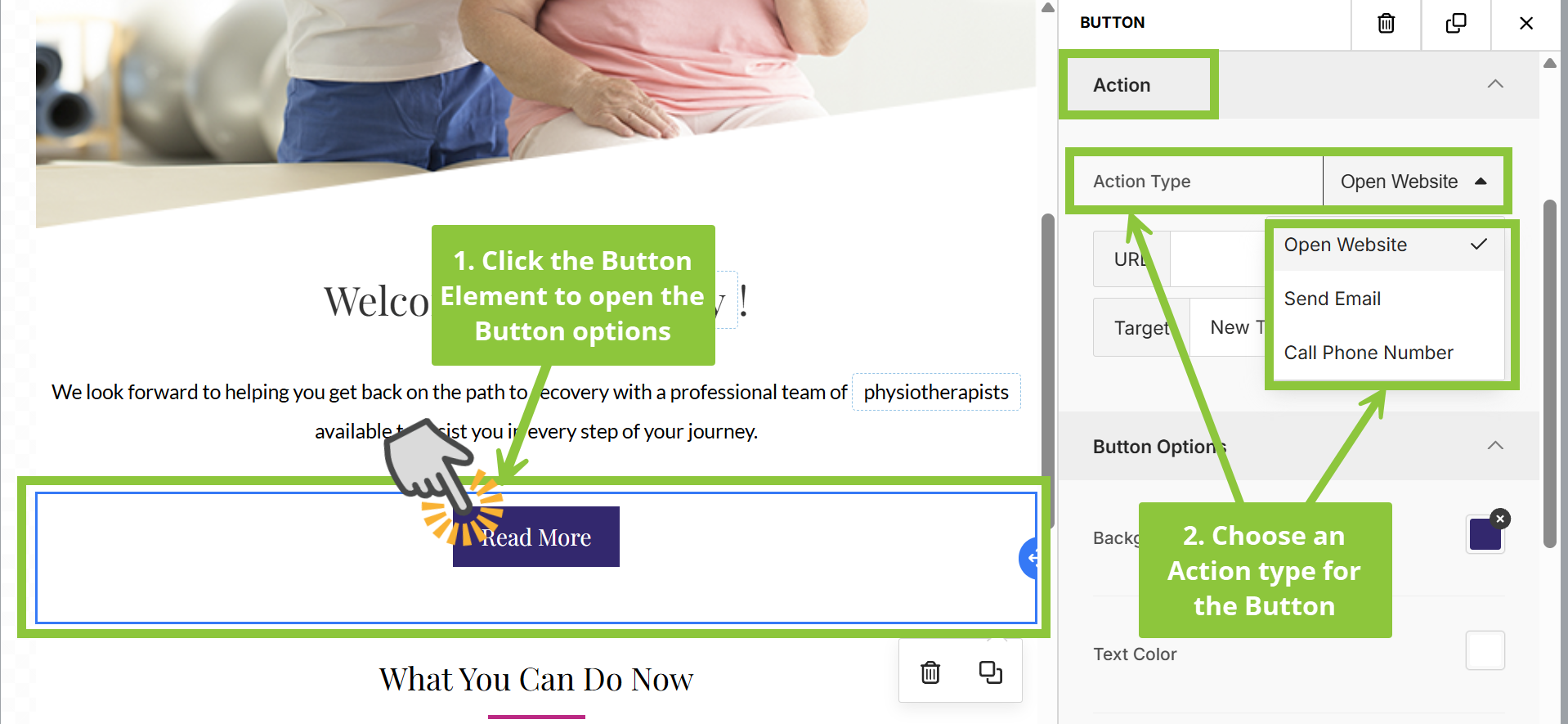 Under Action, you’ll be able to choose an Action Type to decide what happens when the button is clicked: open a website, send an email or call a phone number