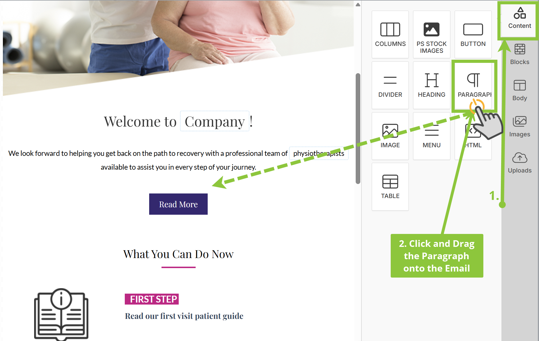 3) Head to the Content tab on the right-most side of the editor and click and drag the Paragraph element onto your email where you’d like to place it.