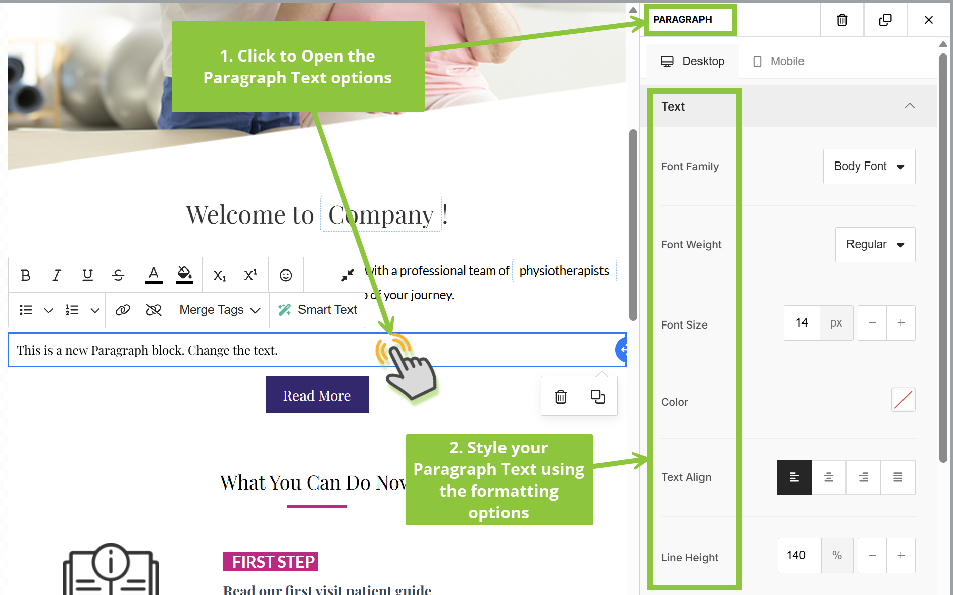 5) To make formatting changes to the Paragraph, click on the Paragraph element it to open the Paragraph options on the right side of your Email editor, where you’ll be able to set the text font, sizing, color, heading background color, etc.