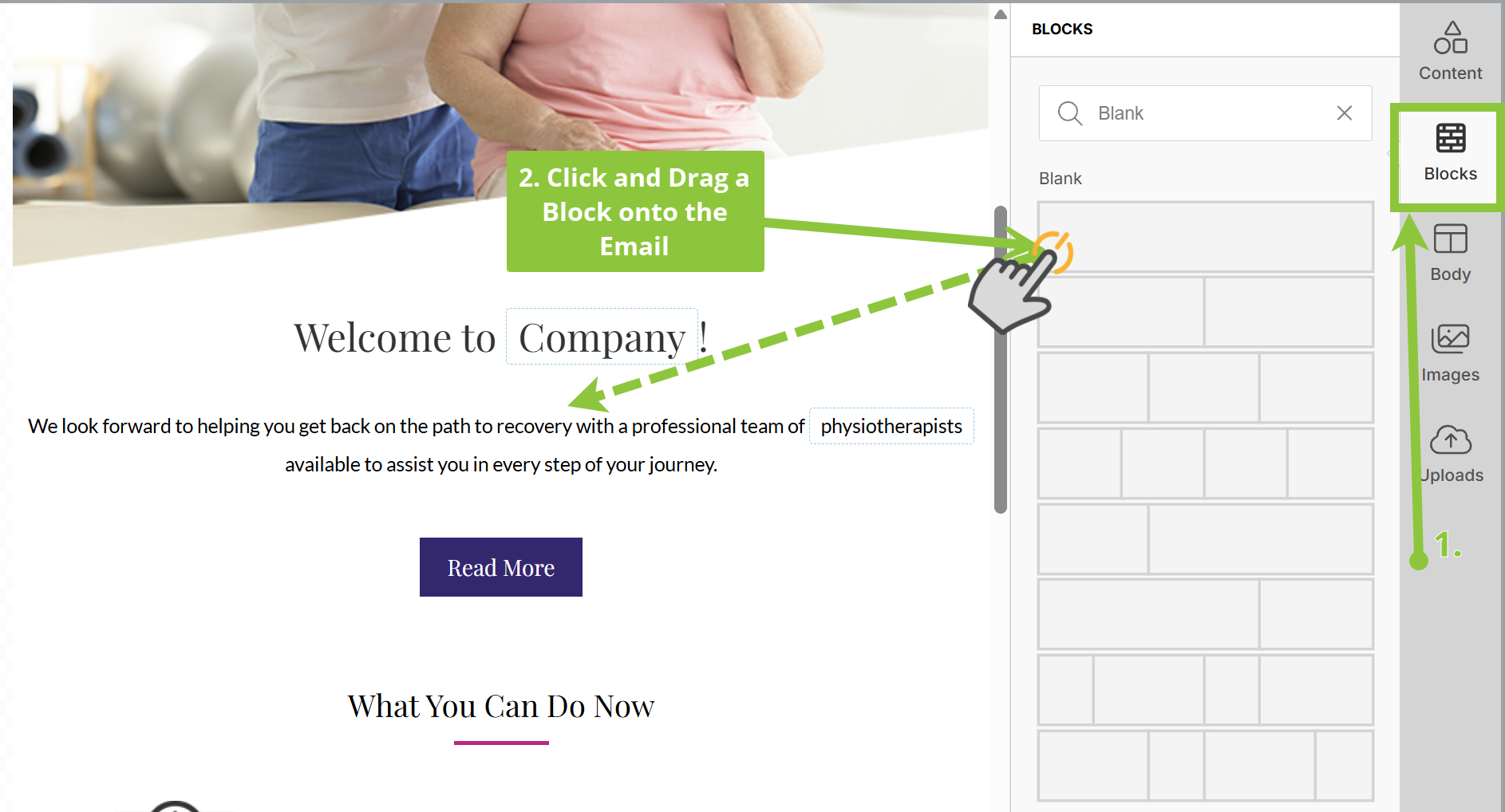 3) Head to the Blocks tab on the right-most side of the editor and click and drag an Empty block (row) onto your email where you’d like to place it.