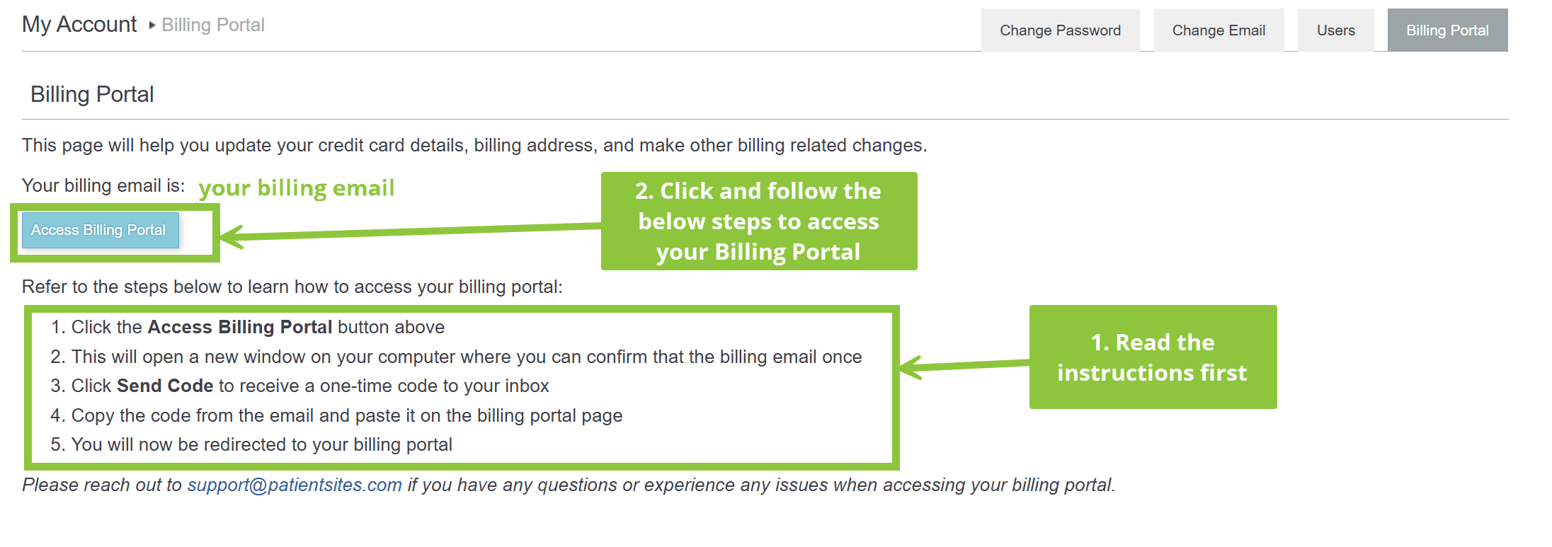 3) You will see the instructions to access the Billing portal here, along with a blue “Access Billing Portal” button. Make sure to read the instructions before clicking the button: