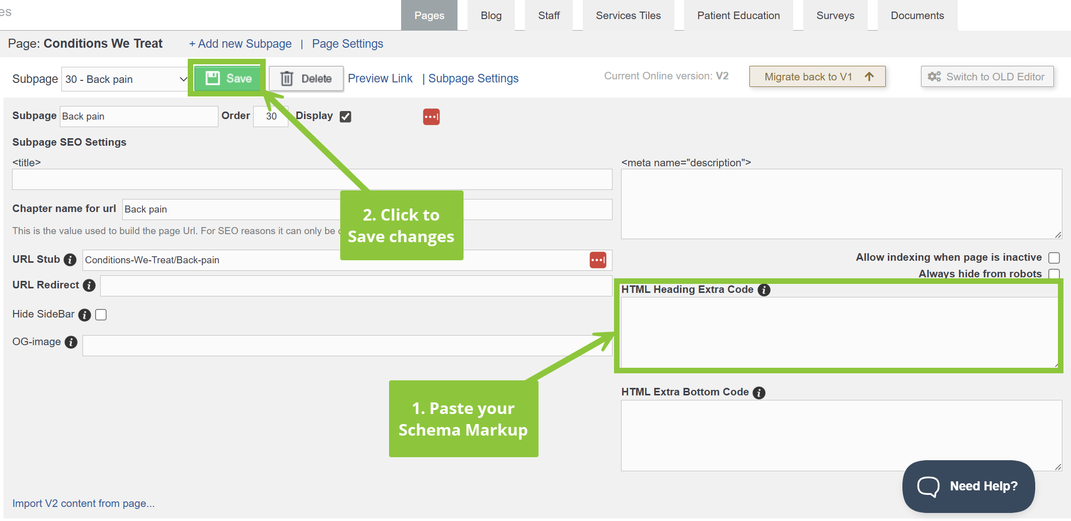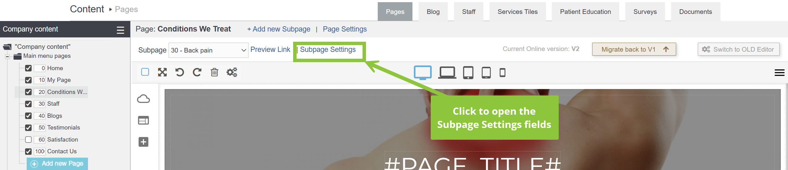 4) At the top of the Page editor click Subpage Settings additional fields to set up the page details.