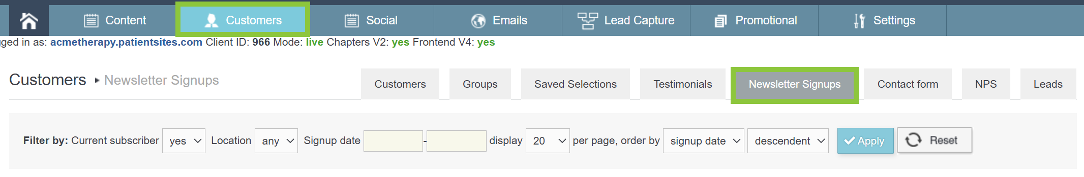 2) Click on Customers in the main menu, then choose the Newsletter Signups submenu.