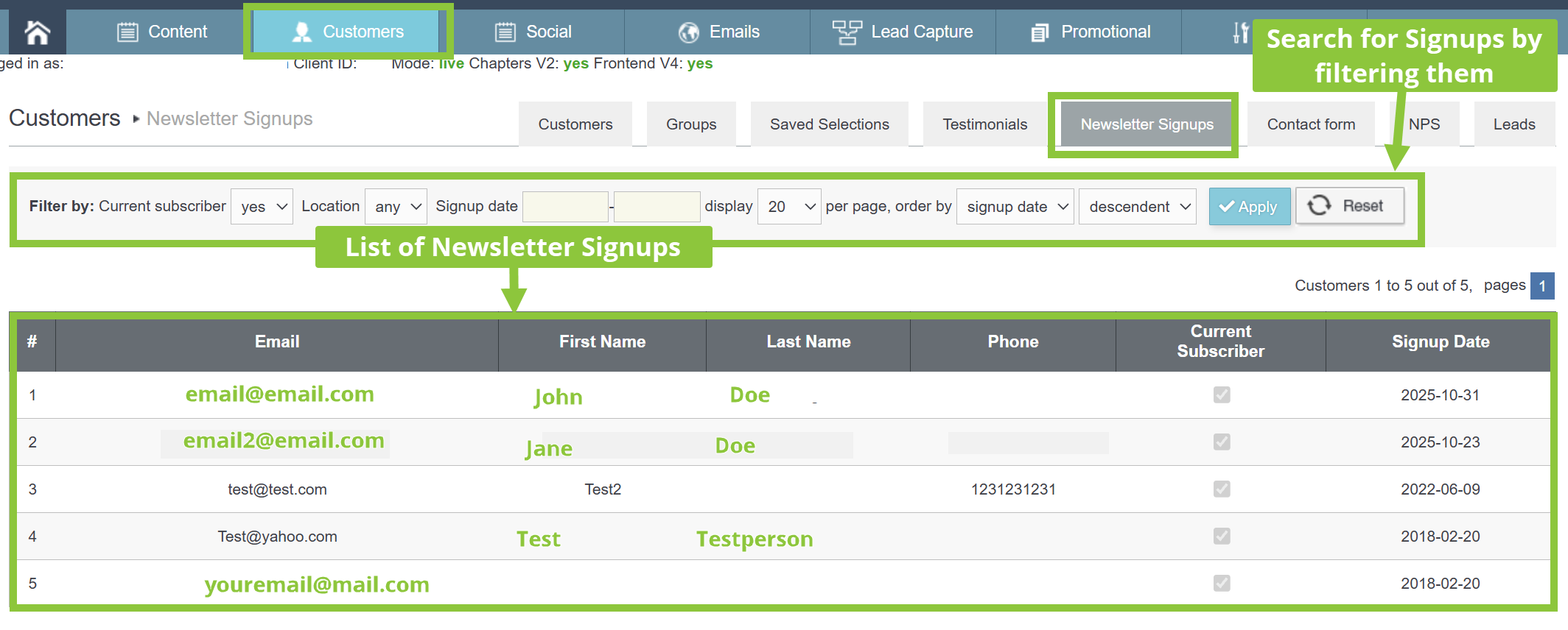 3) You will see a list of your Newsletter Signups from customers here, which you’ll be able to search for signups by filter them based on: