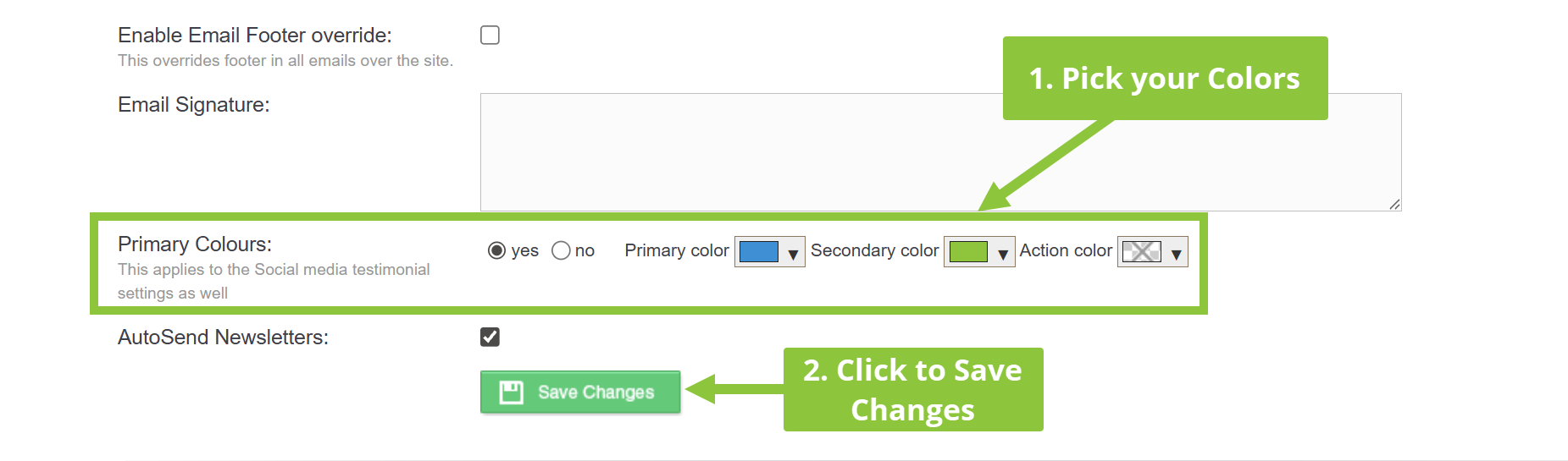 3) Scroll down to the “Primary Colour” section. Use the Color pickers to add your brand colors, and hit “Save Changes”.