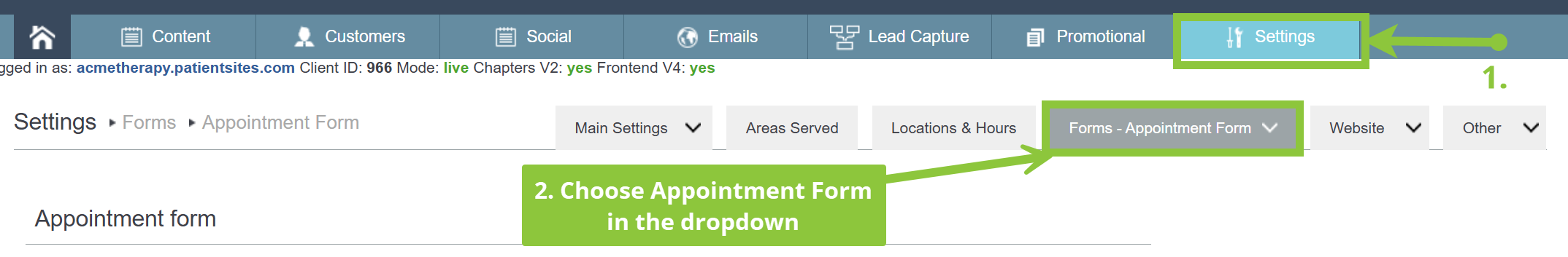 2) Head to Settings, and in the Forms tab, click Appointment Form from the dropdown menu.
