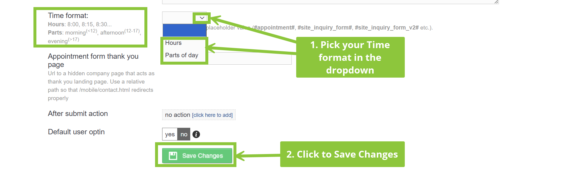 3) In the “Time format” dropdown you will be able to choose between Hours (set to 5 minute increments) and Parts of day (morning, afternoon, evening).