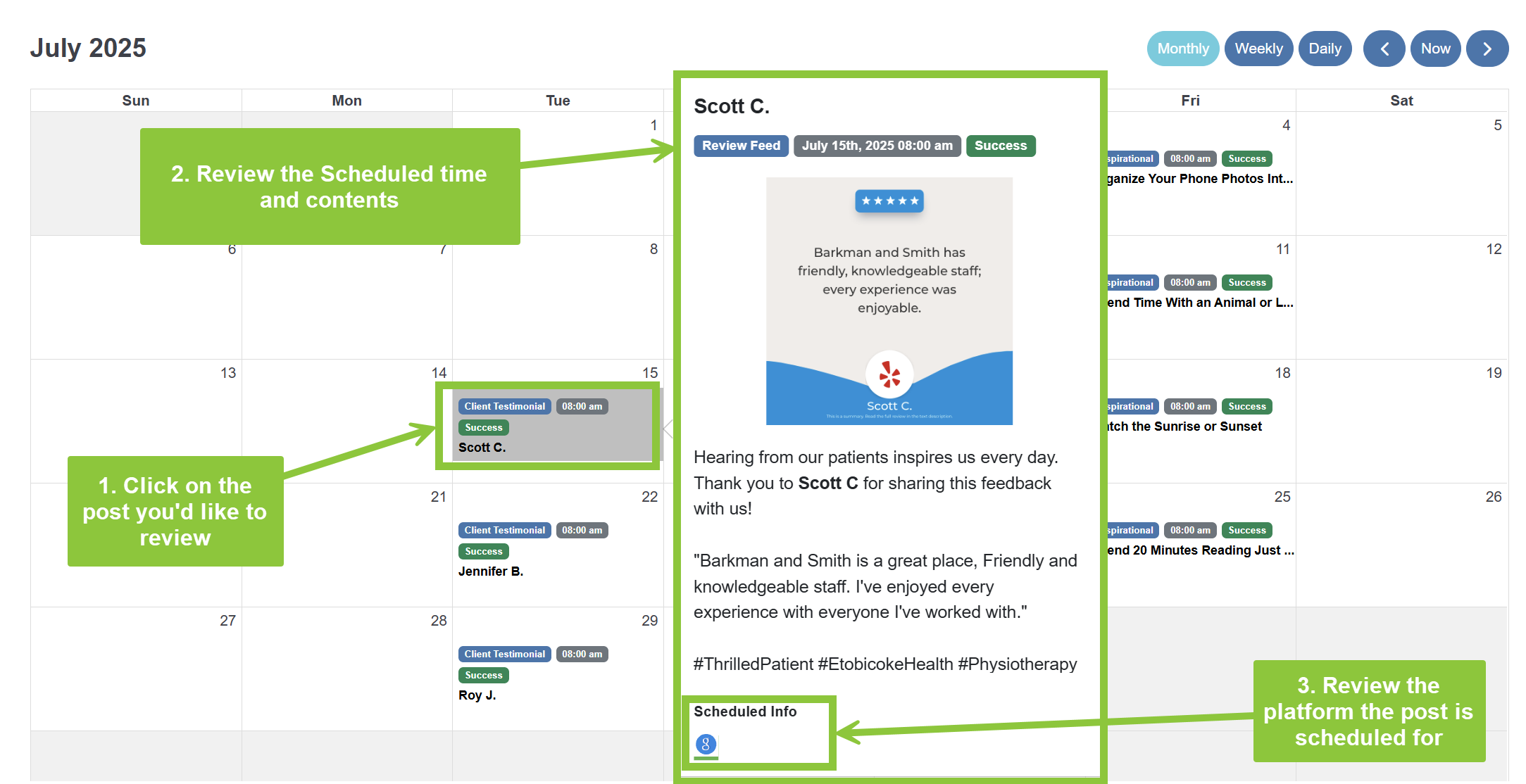 3) Click on a Tuesday post in the calendar to view the contents of the post, the time and platform it’s scheduled for will show up in a floating box.