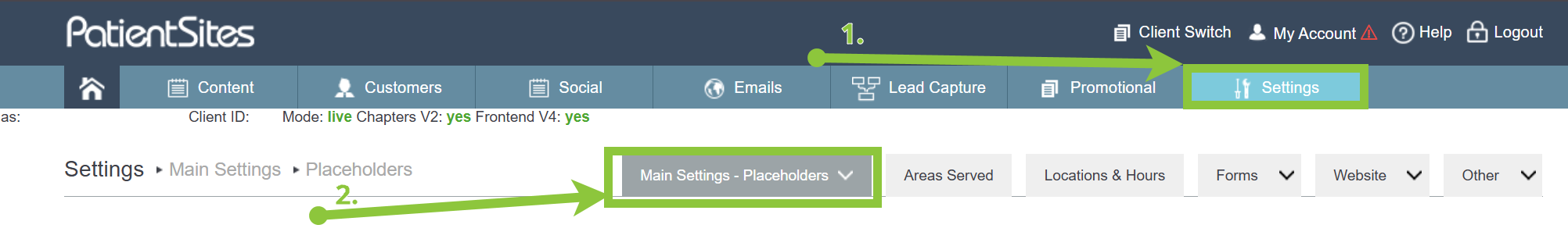 2) Head over to Settings in the main menu and go to the Main Settings - Placeholders tab. (this tab should be selected by default, but Placeholders is the first item in the Main Settings dropdown)