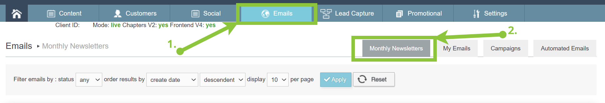 2) Head over to Emails in the main menu and click the Monthly Newsletters tab.