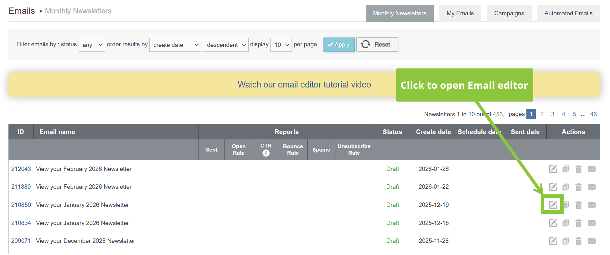 3) Choose the Newsletter you wish to edit, and click the Pencil and Paper icon at the end of its row under the Actions column.