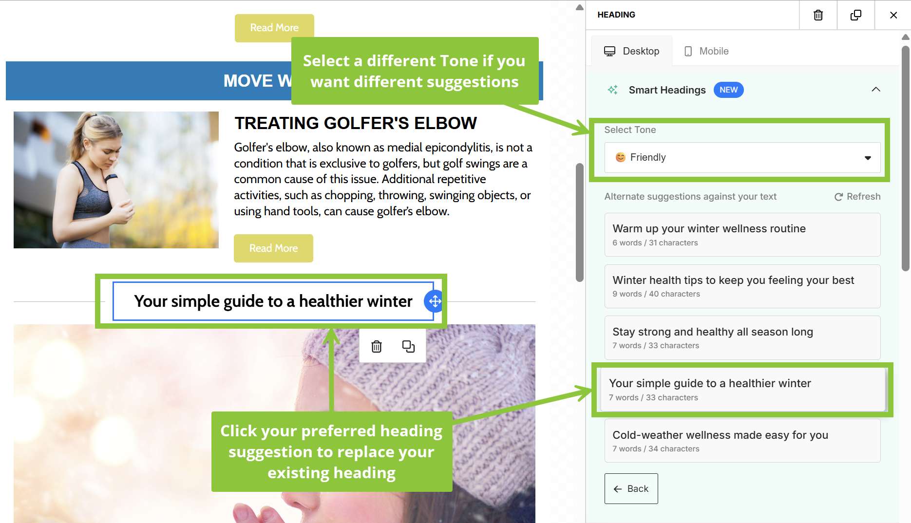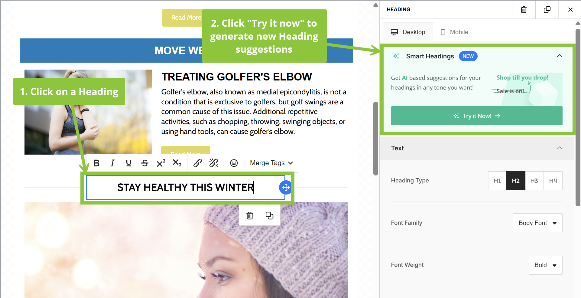 - Click on the heading you’d like to improve to open the Heading options on the right side of the Email editor.