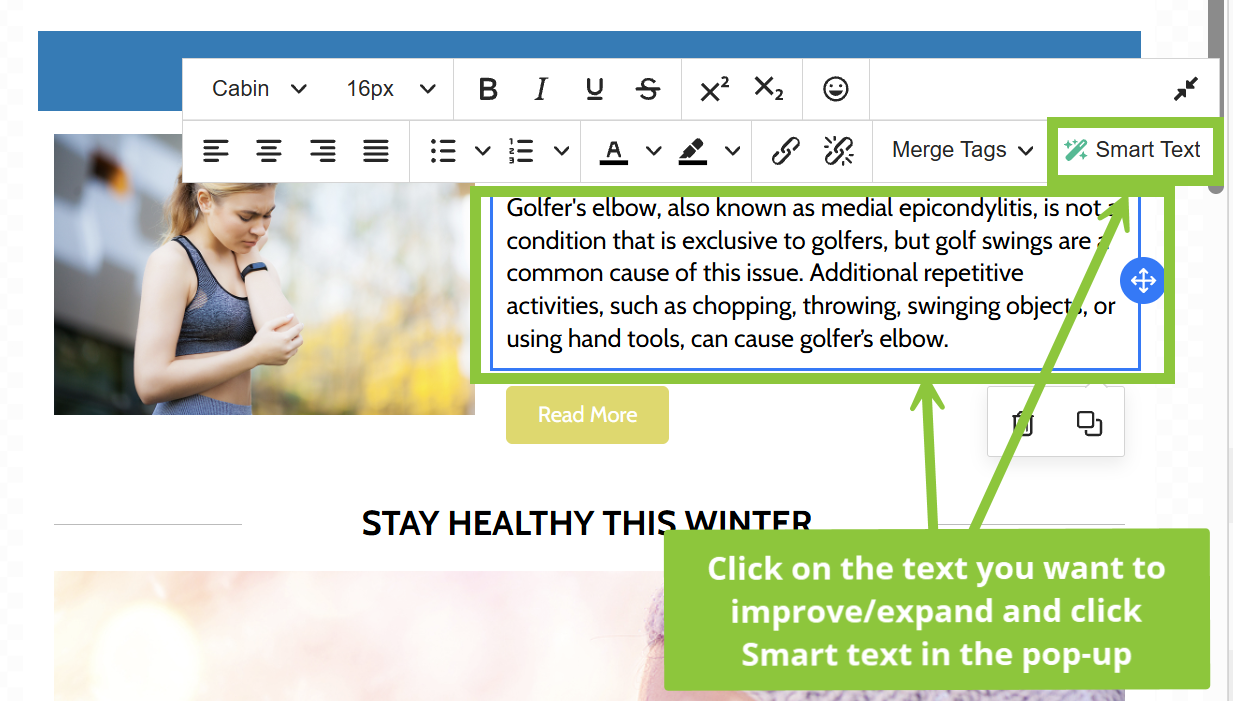- Click on the text box you’d like to improve or expand and click the “Smart Text” button in the pop-up toolbar