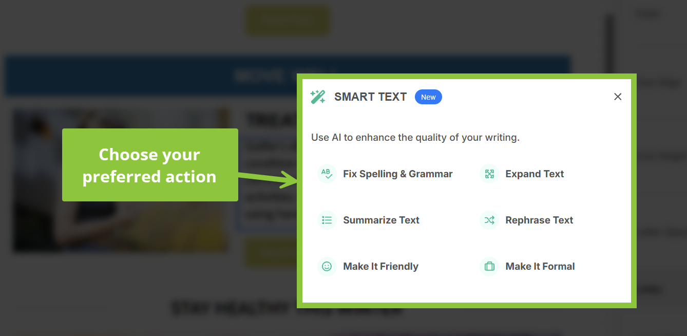 - Choose your preferred action: Fix Spelling and Grammar, Expand Text, Summarize Text, Rephrase Text, Make it Friendly, Make it formal